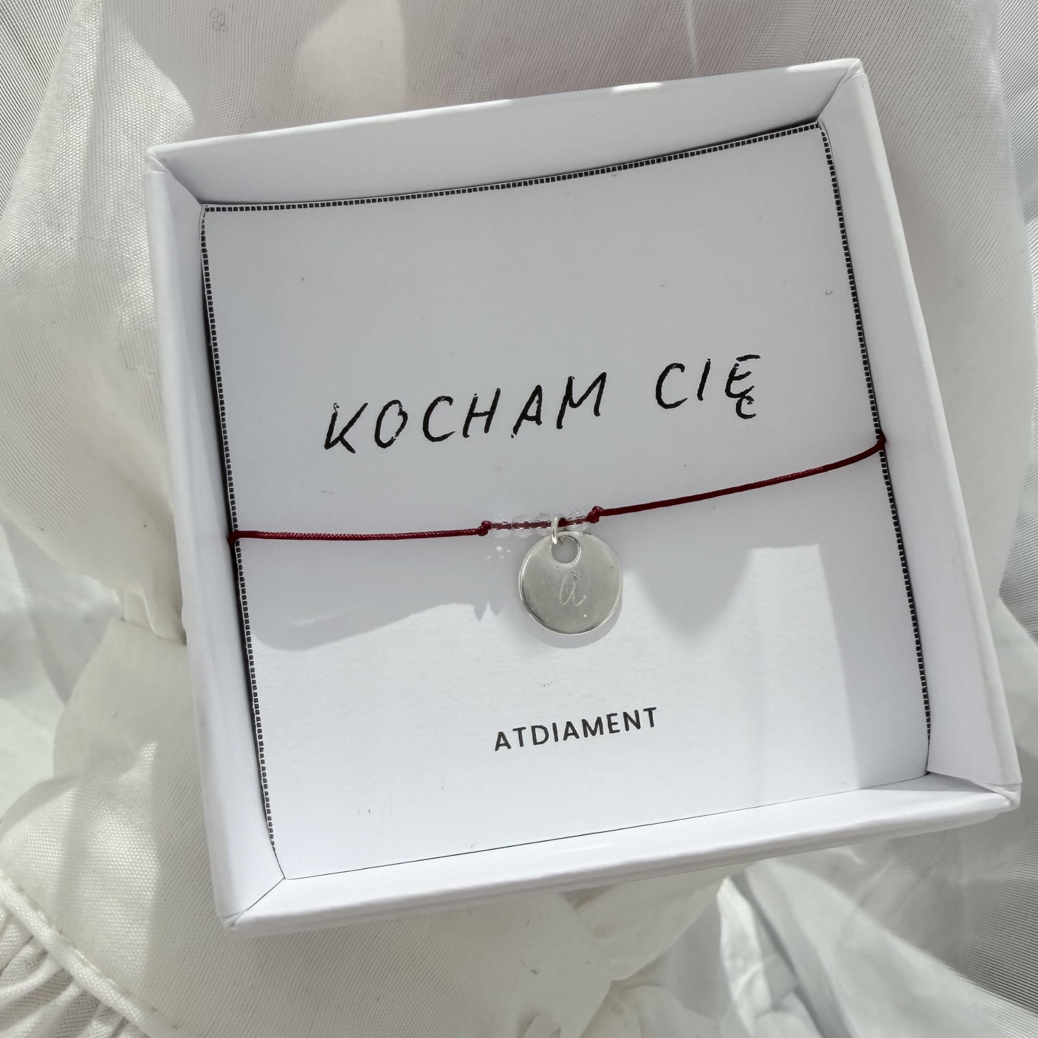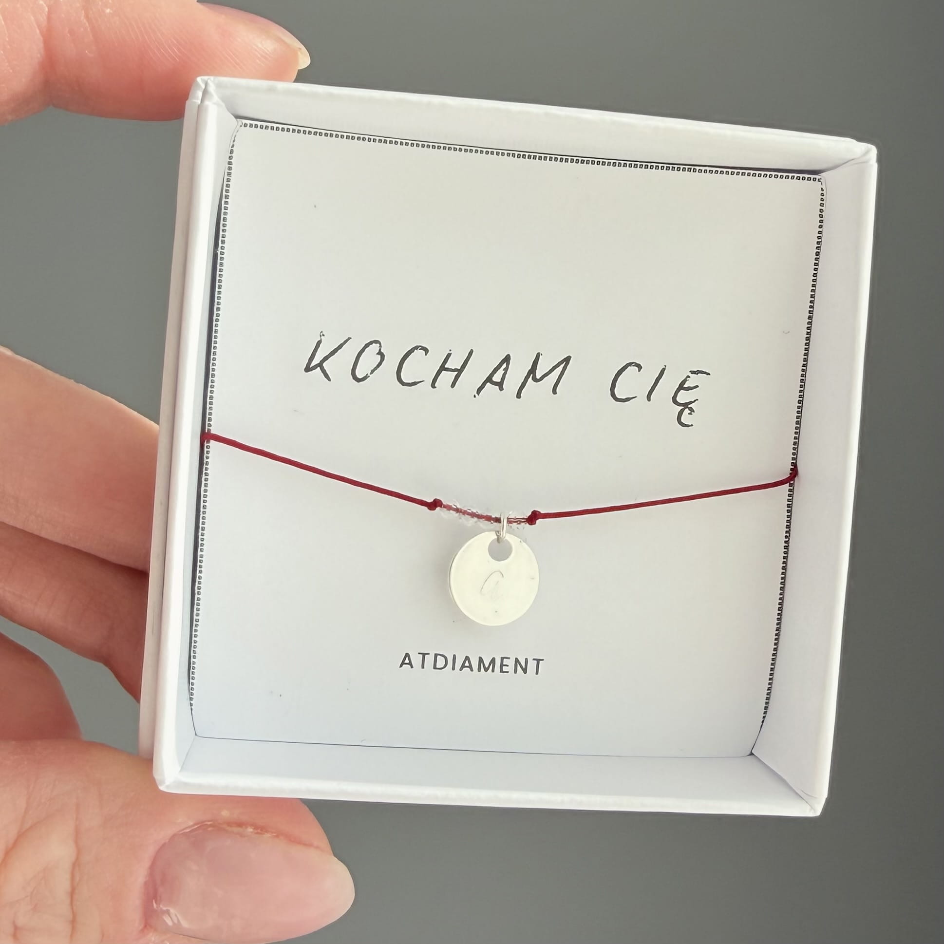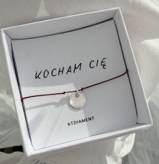 Bransoletka na jubilerskim sznurku ze srebrną blaszką wykonaną z najwyższej próby srebrna 925 lub srebrną i pozłoconą 24 karatowym złotem karteczka z intencją "KOCHAM CIĘ"