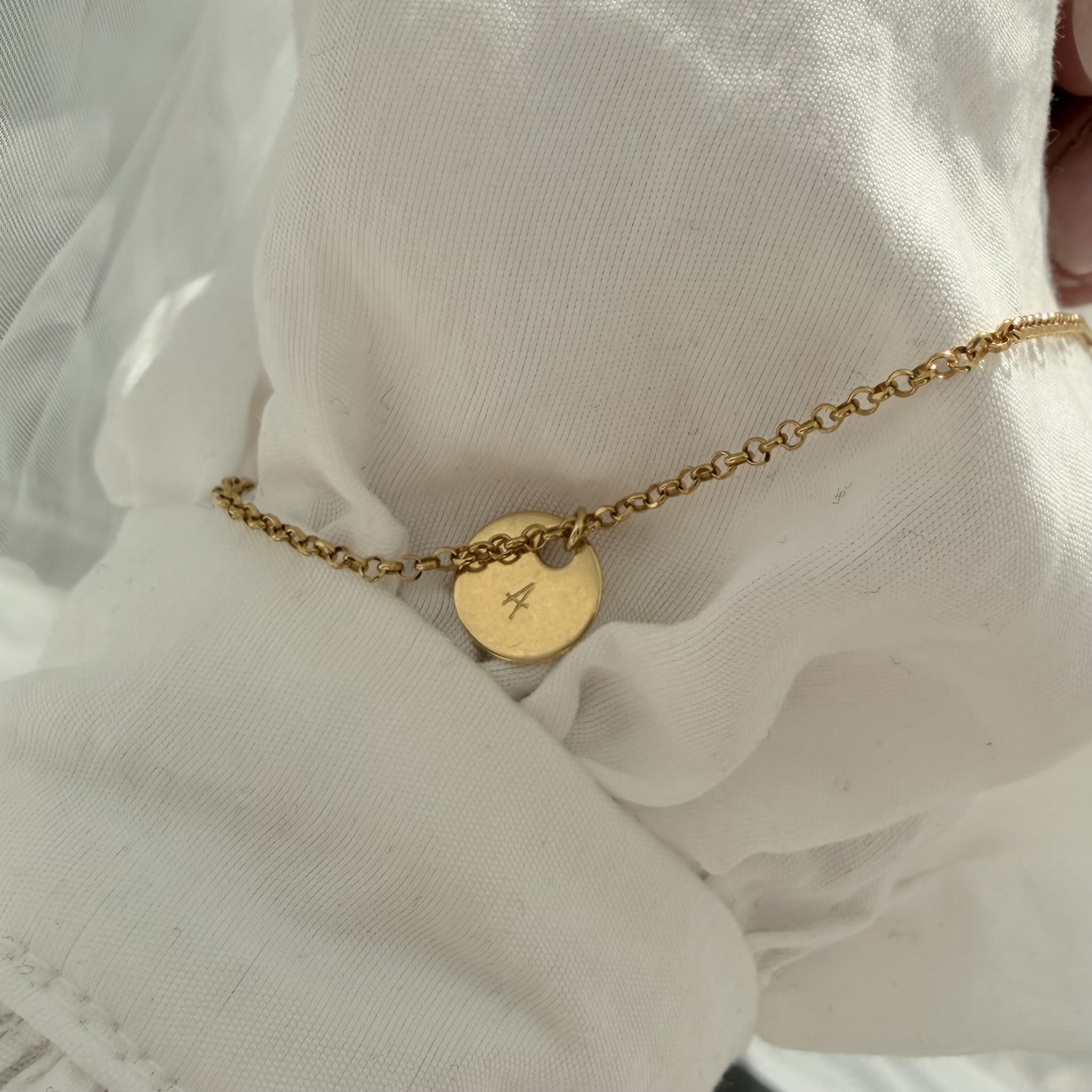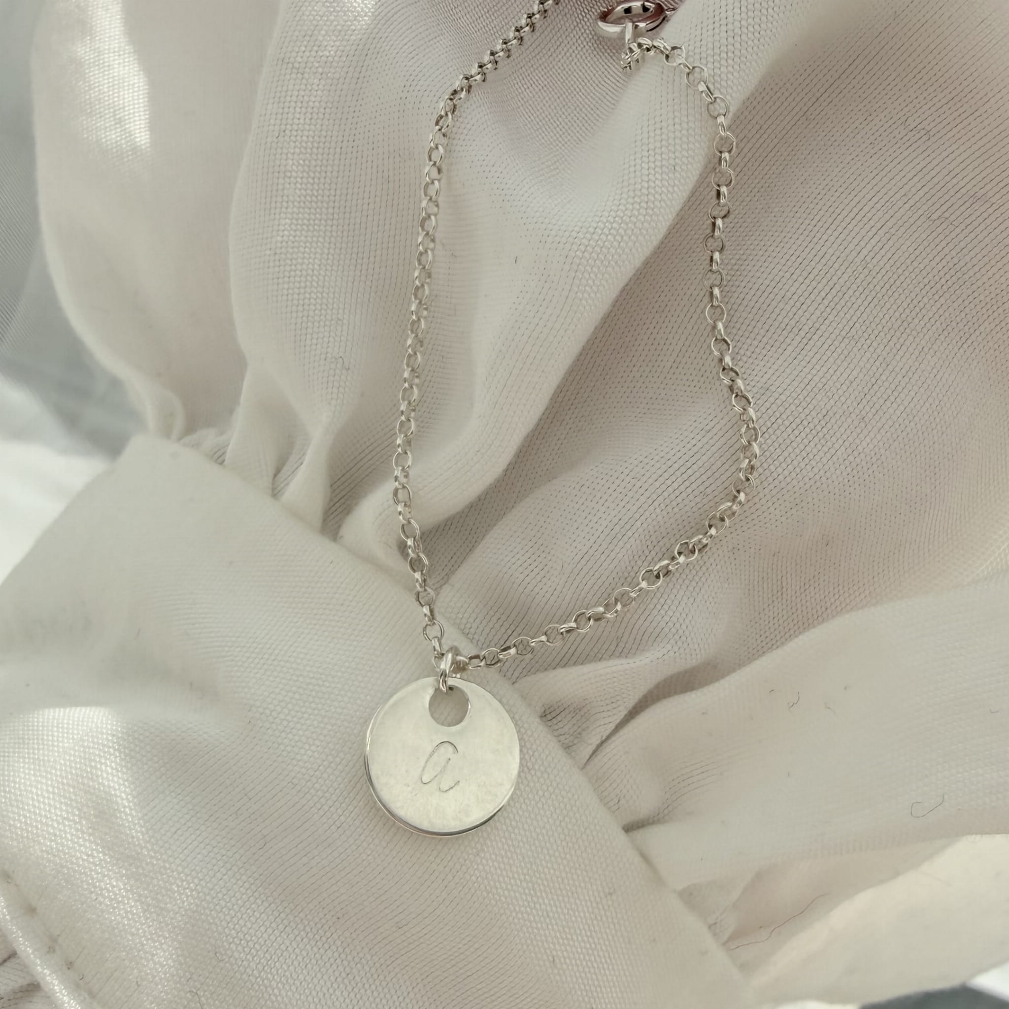 Personalizowana bransoletka z literką to subtelna, ponadczasowa biżuteria wykonana ze srebra próby 925 lub srebra pozłacanego 24-karatowym złotem. Okrągła blaszka o średnicy 8 mm i ręcznie wybity inicjał tworzą delikatny dodatek, idealny do codziennego noszenia lub jako osobisty prezent.
