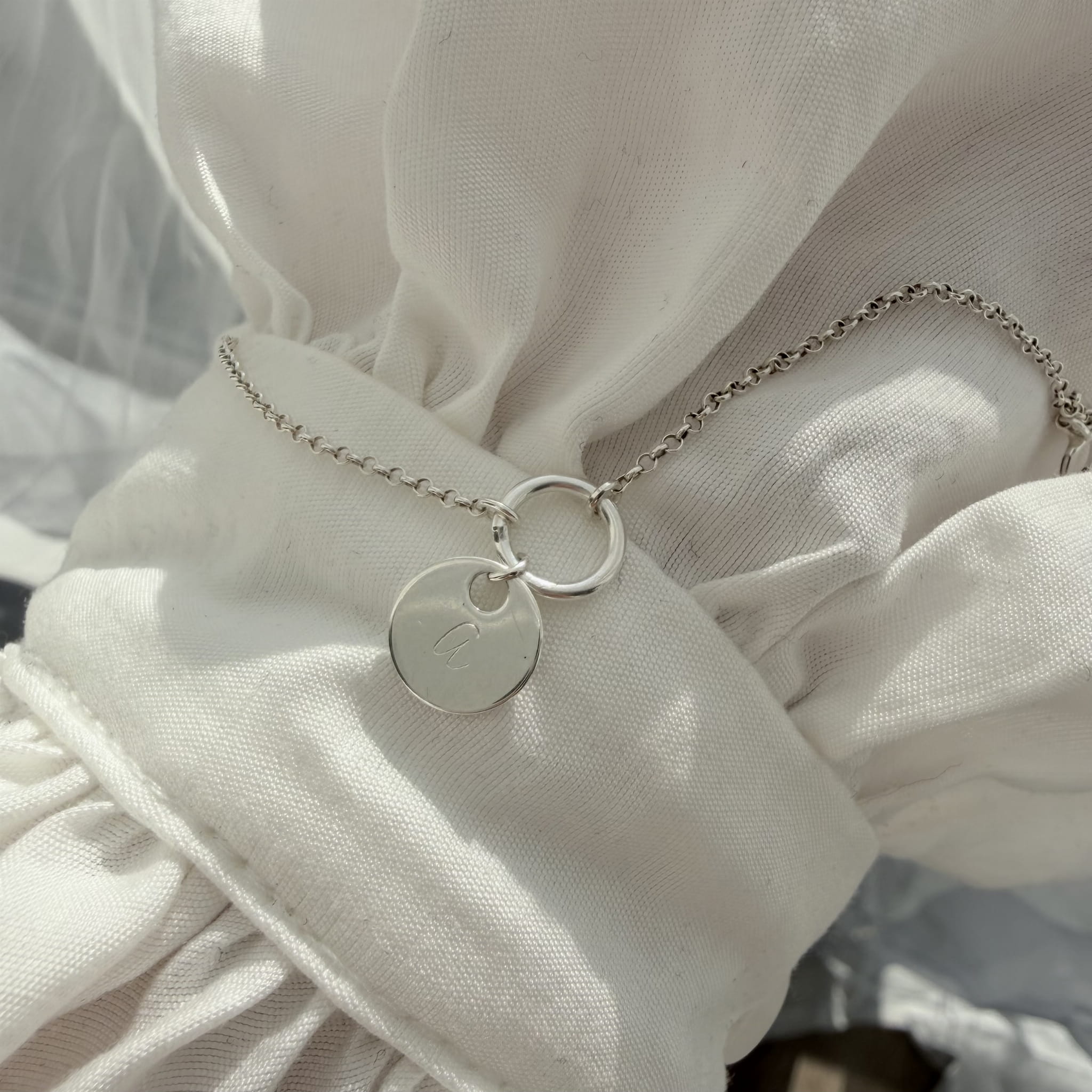 Personalizowana bransoletka z literką to subtelna, ponadczasowa biżuteria wykonana ze srebra próby 925 lub srebra pozłacanego 24-karatowym złotem. Okrągła blaszka o średnicy 8 mm i ręcznie wybity inicjał tworzą delikatny dodatek, idealny do codziennego noszenia lub jako osobisty prezent.