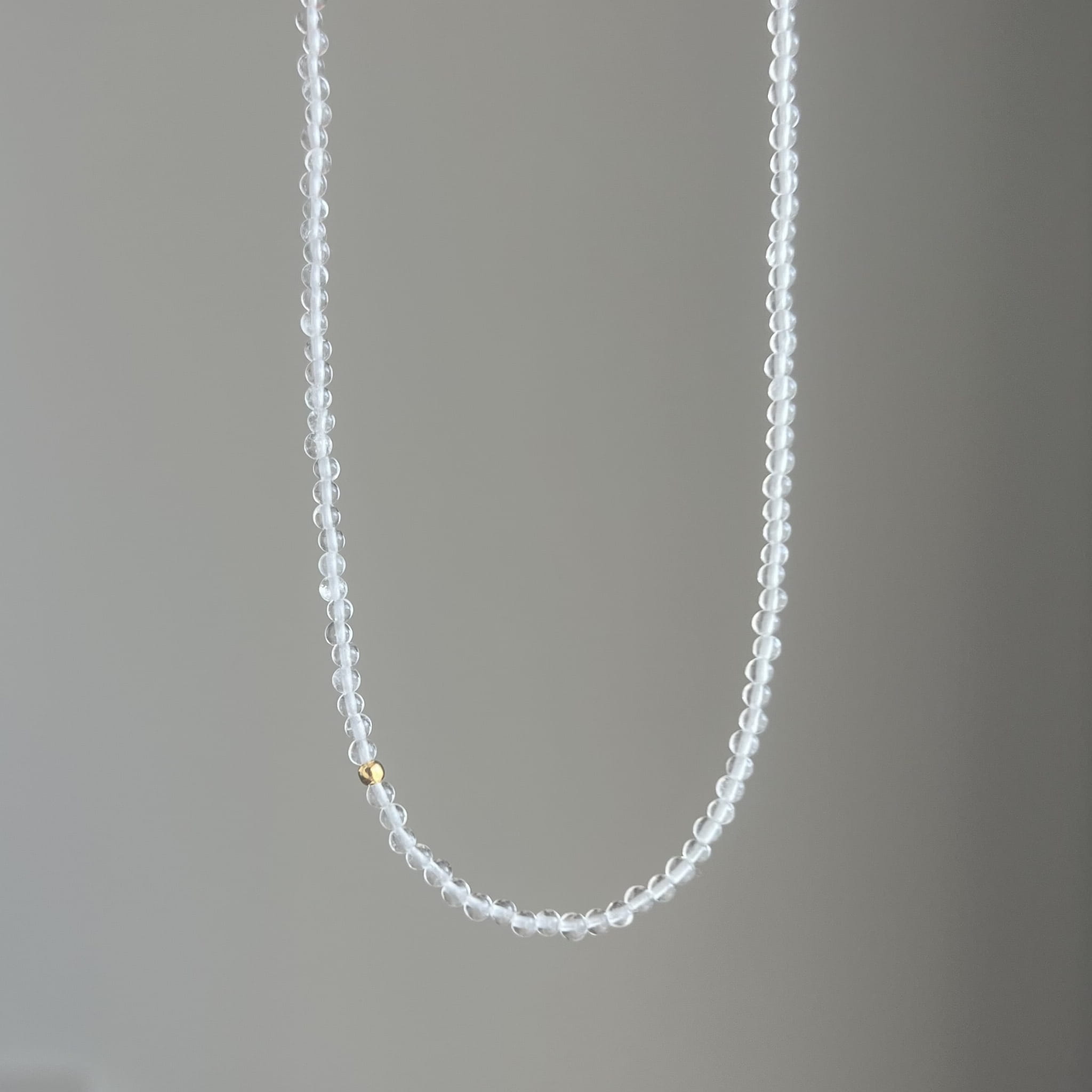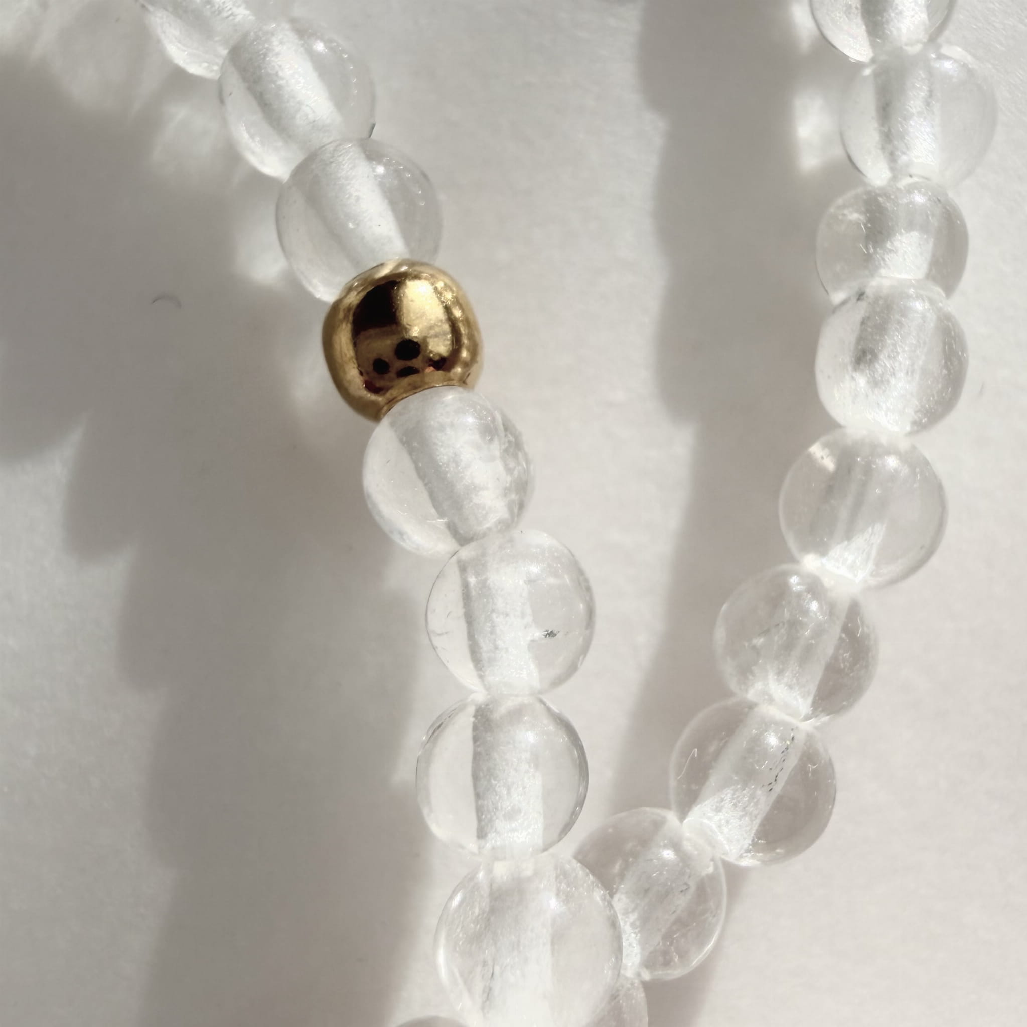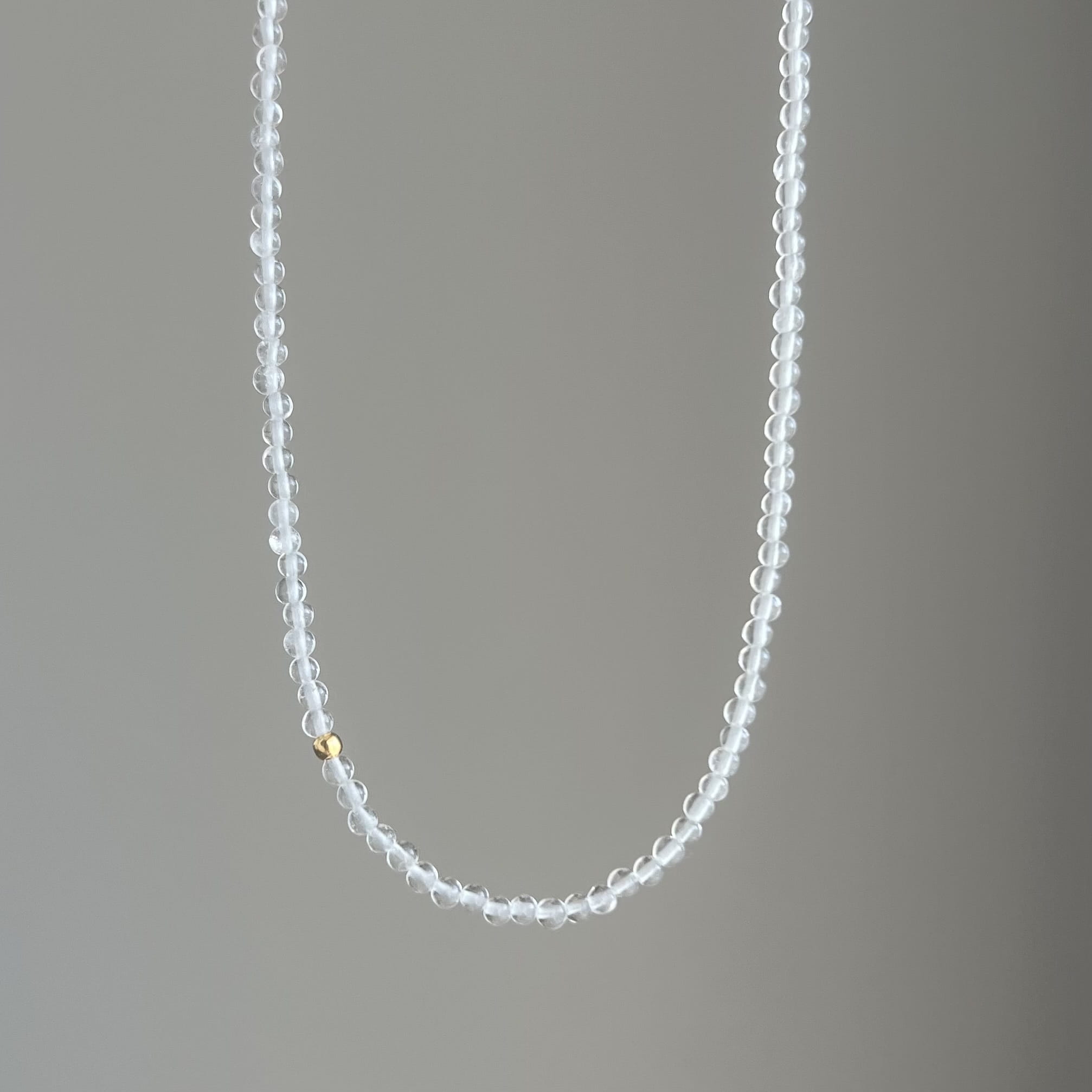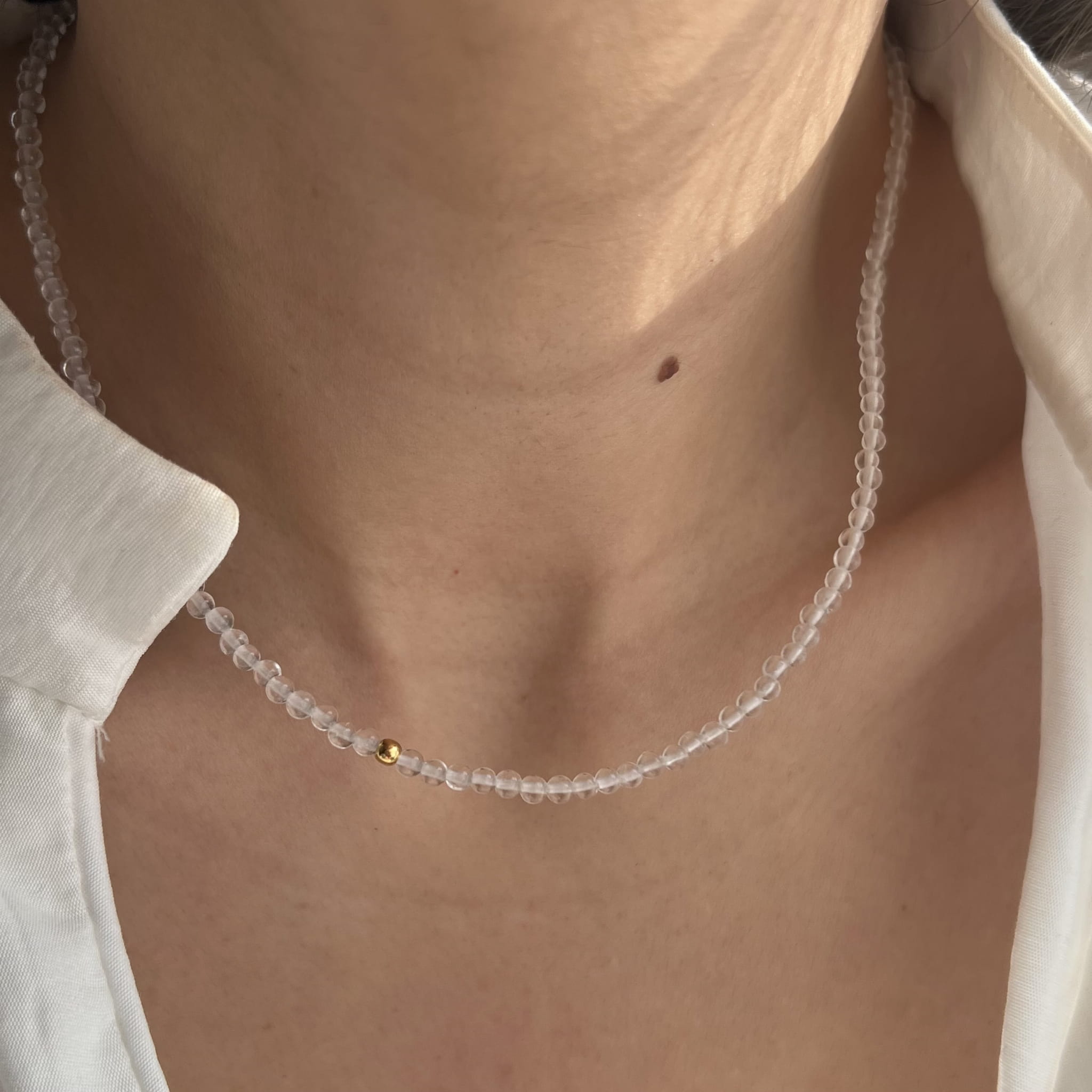 Naszyjnik KRYSZTAŁ GÓRSKI POŁYSK noś solo do jasnych tkanin – bieli, beżu lub szarości – aby podkreślić naturalny połysk kamieni. Świetnie sprawdzi się także w stylizacjach warstwowych, połączony z cienkim srebrnym lub pozłacanym łańcuszkiem. To idealny wybór do lekkich sukienek, koszul i letnich stylizacji w naturalnym, eleganckim