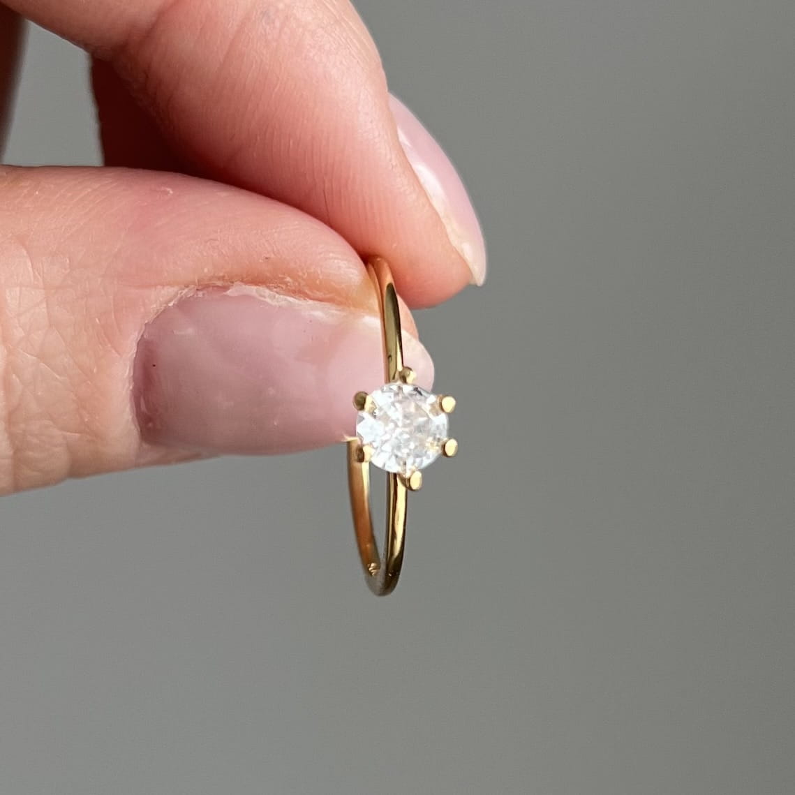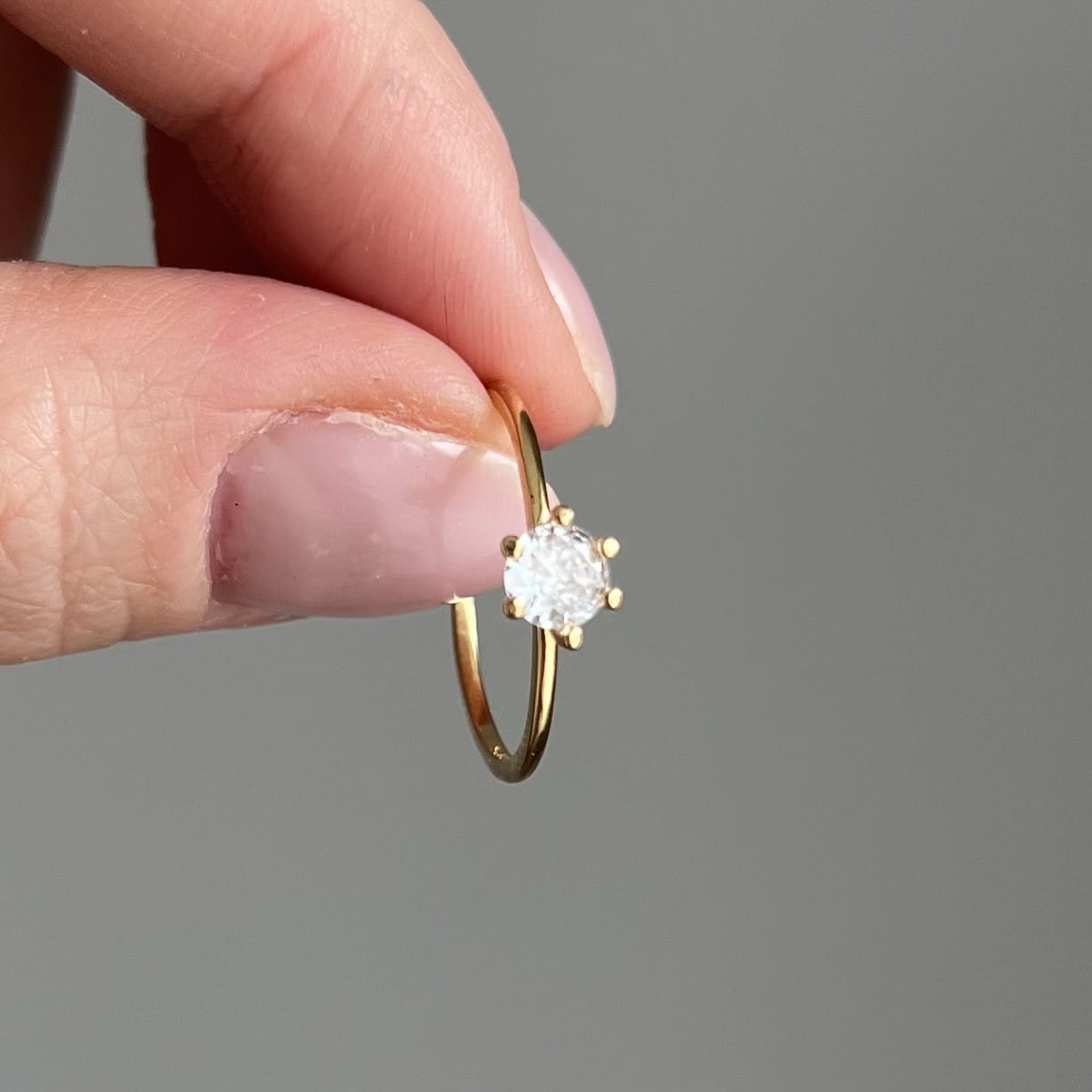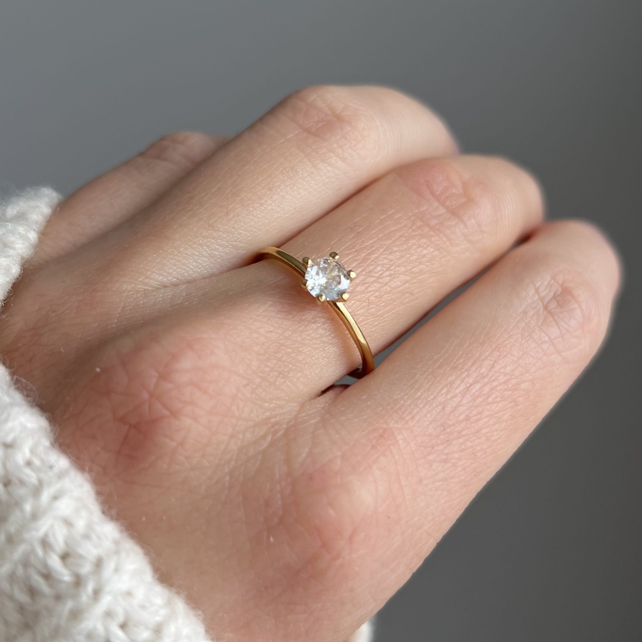 Centralnie osadzona cyrkonia o średnicy 5 mm jest pięknie wypolerowana i efektownie odbija światło, dodając dłoni subtelnego blasku. Pierścionek waży ok. 1,15 g, dzięki czemu jest lekki, wygodny i idealny do noszenia na co dzień.