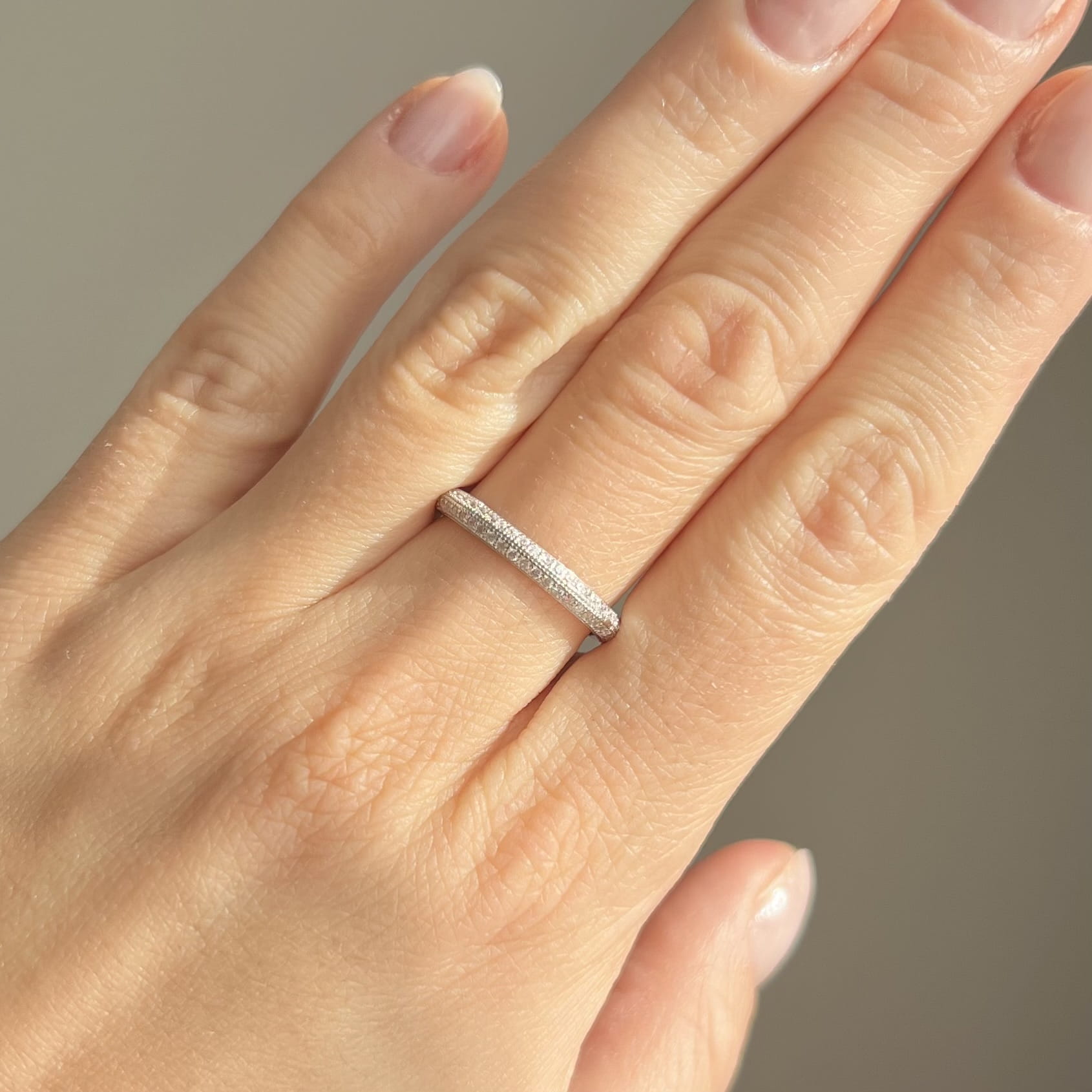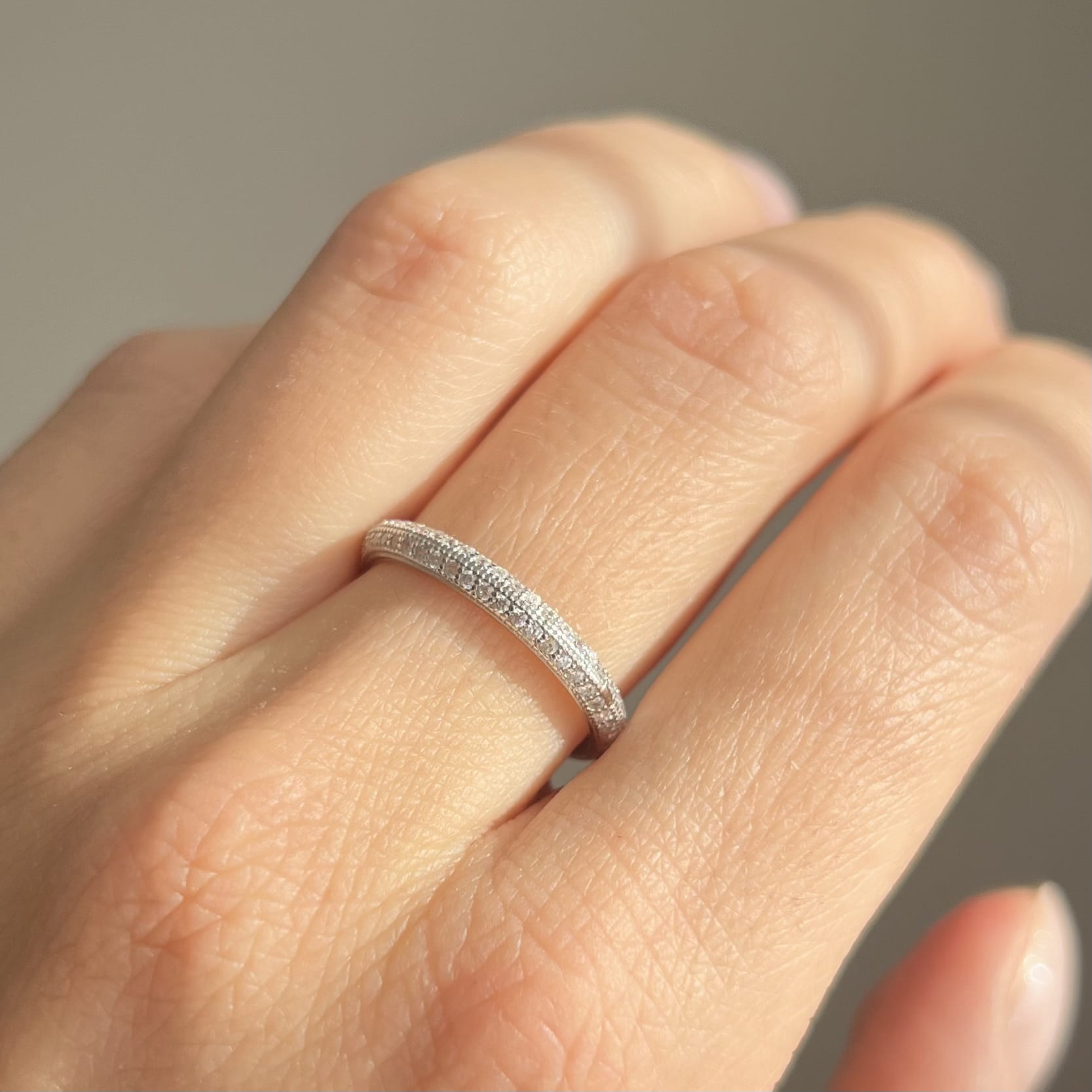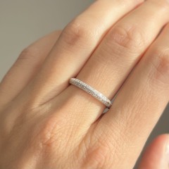 Jego obrączkowa forma o szerokości 2,85 mm ozdobiona jest drobnymi, precyzyjnie osadzonymi cyrkoniami, które pięknie odbijają światło i tworzą subtelny efekt połysku. Z masą ok. 1,45 g pierścionek jest lekki, wygodny i idealny do codziennego noszenia.