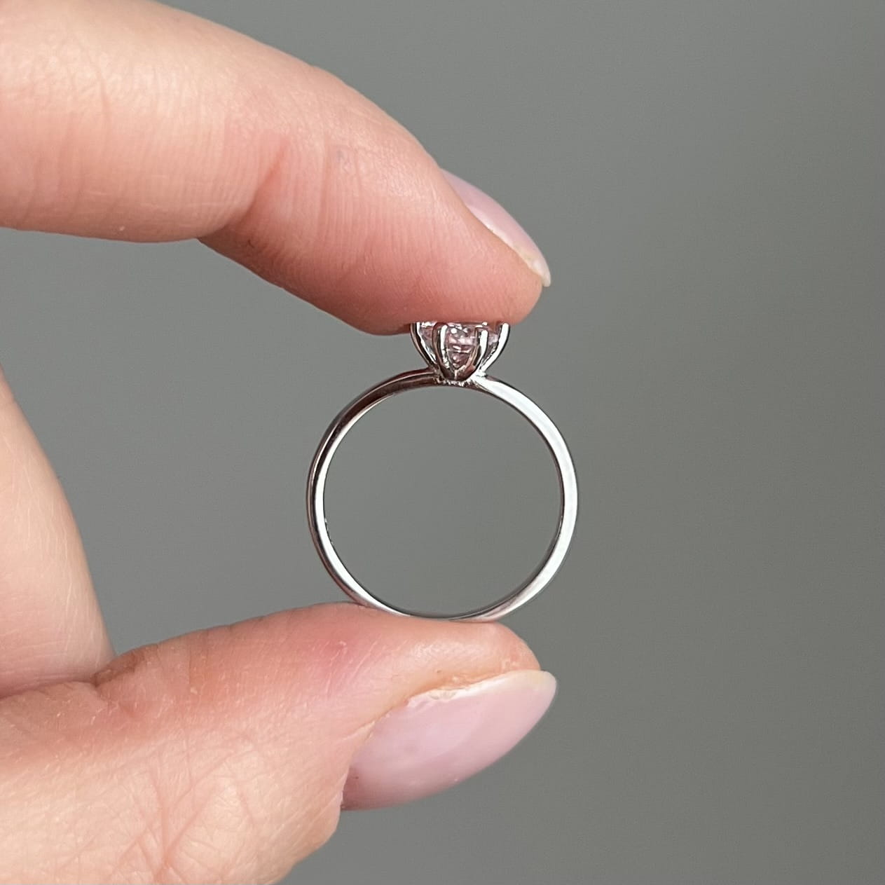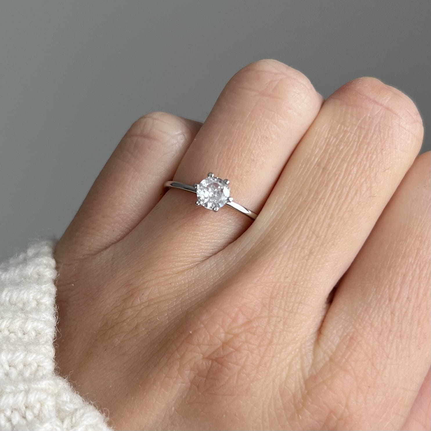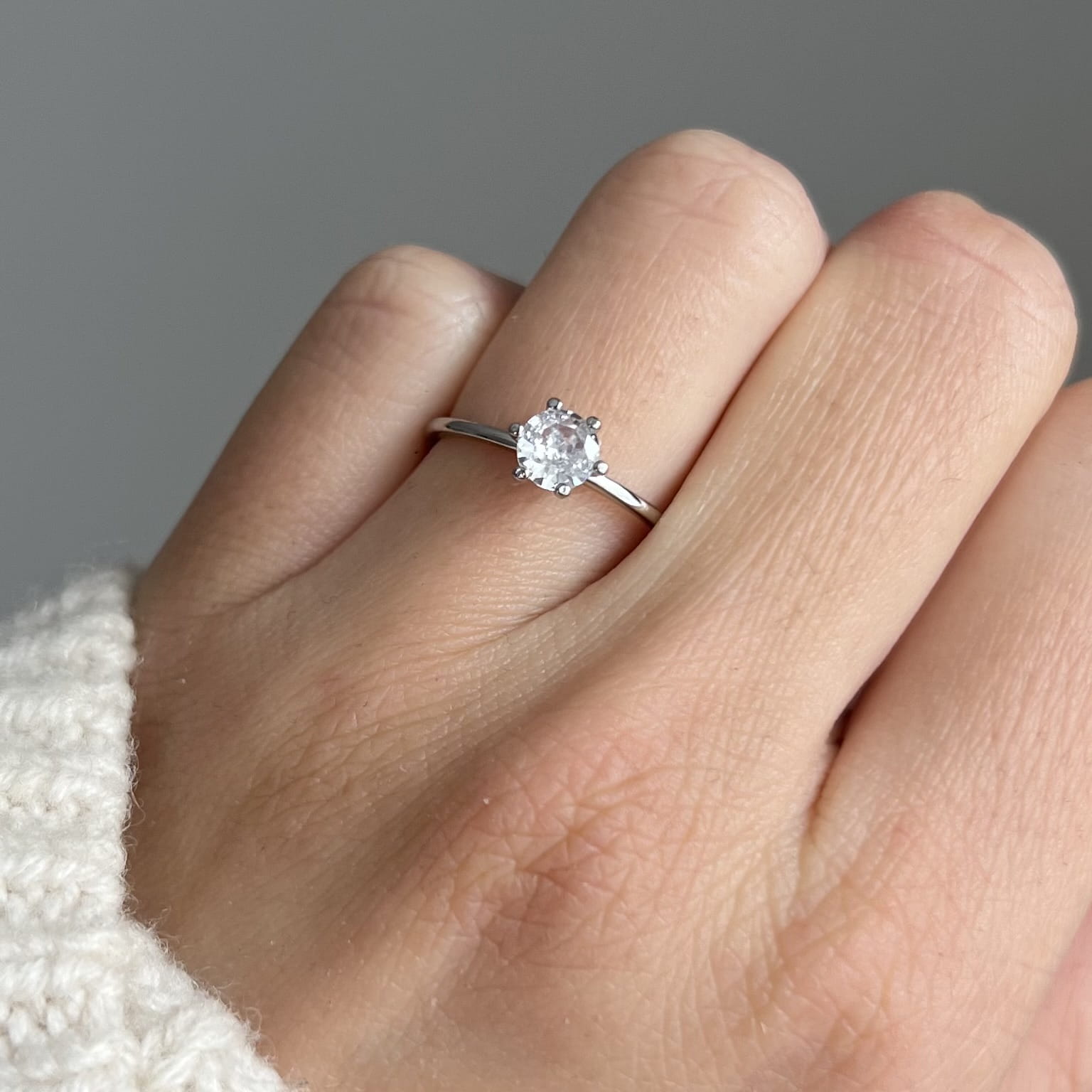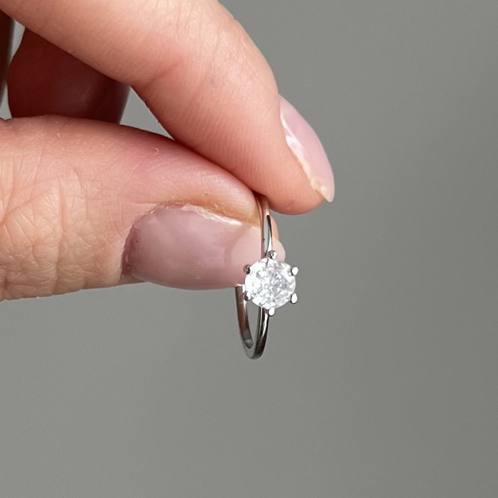 Centralnie osadzona cyrkonia o średnicy 5 mm jest pięknie wypolerowana i efektownie odbija światło, dodając dłoni subtelnego blasku. Pierścionek waży ok. 1,15 g, dzięki czemu jest lekki, wygodny i idealny do noszenia na co dzień.