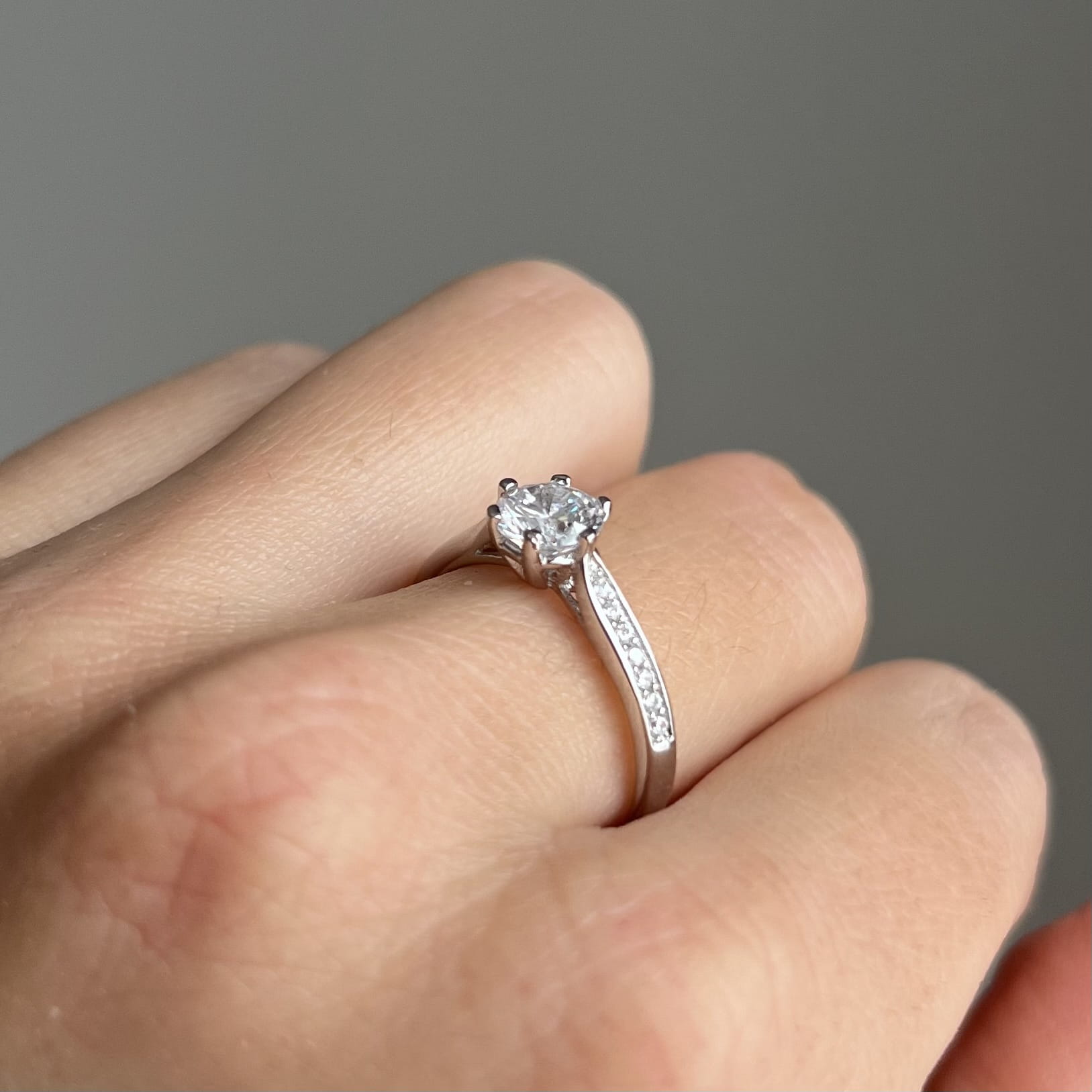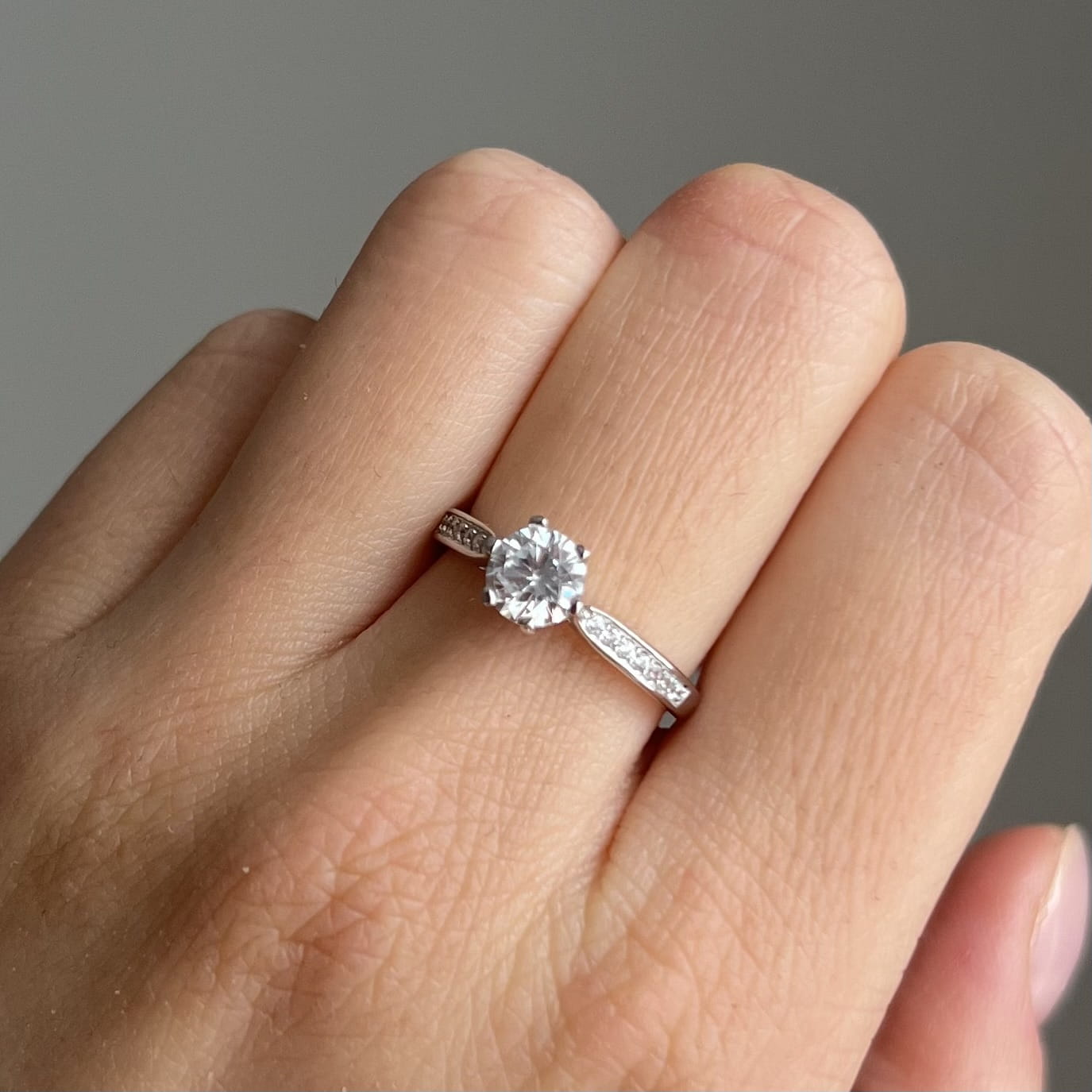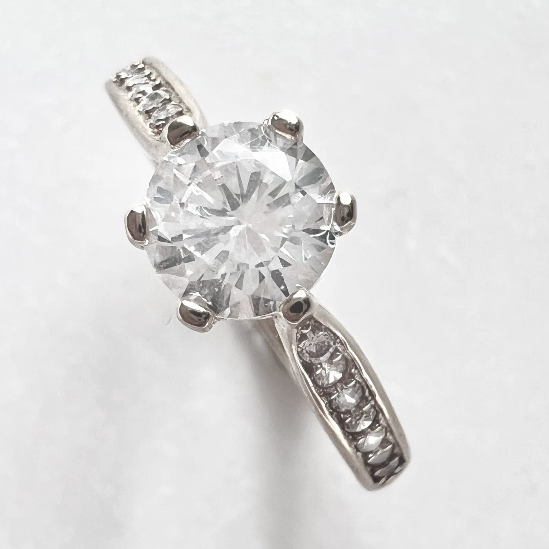 W centrum pierścionka znajduje się cyrkonia o średnicy 6 mm, która pięknie rozprasza światło i stanowi główny akcent modelu. Dodatkowe drobne cyrkonie umieszczone po bokach podkreślają jego blask, tworząc efekt biżuterii o wysokiej elegancji.