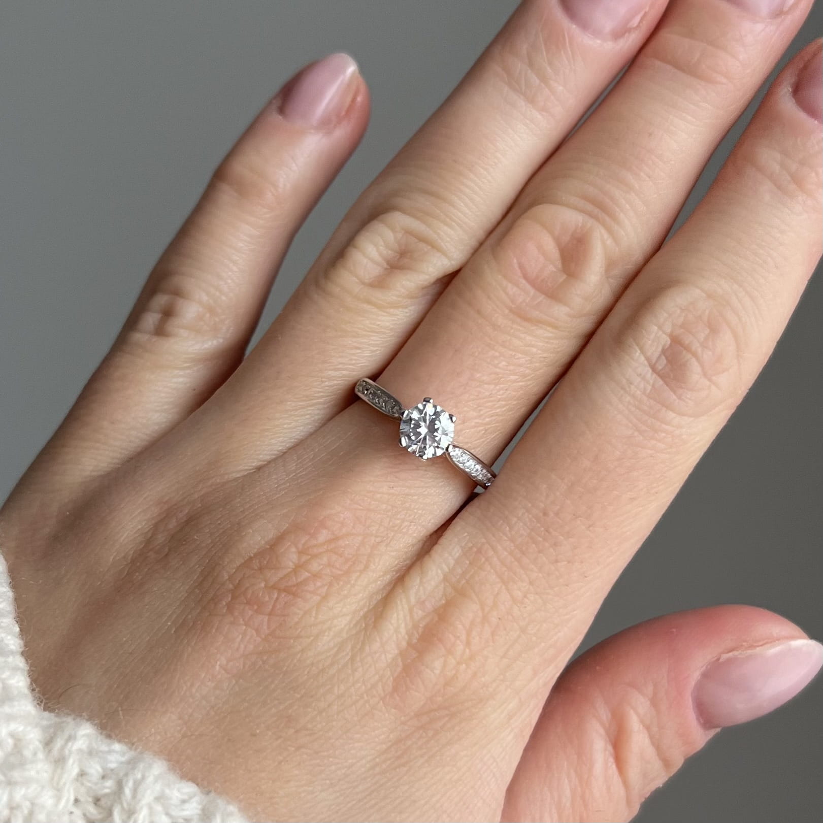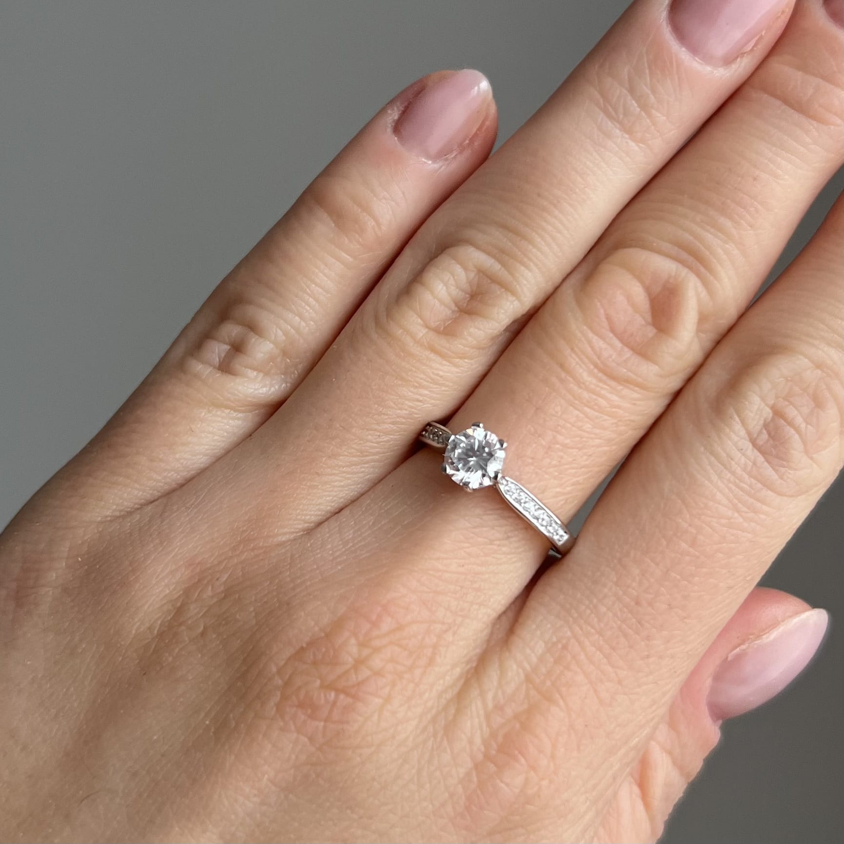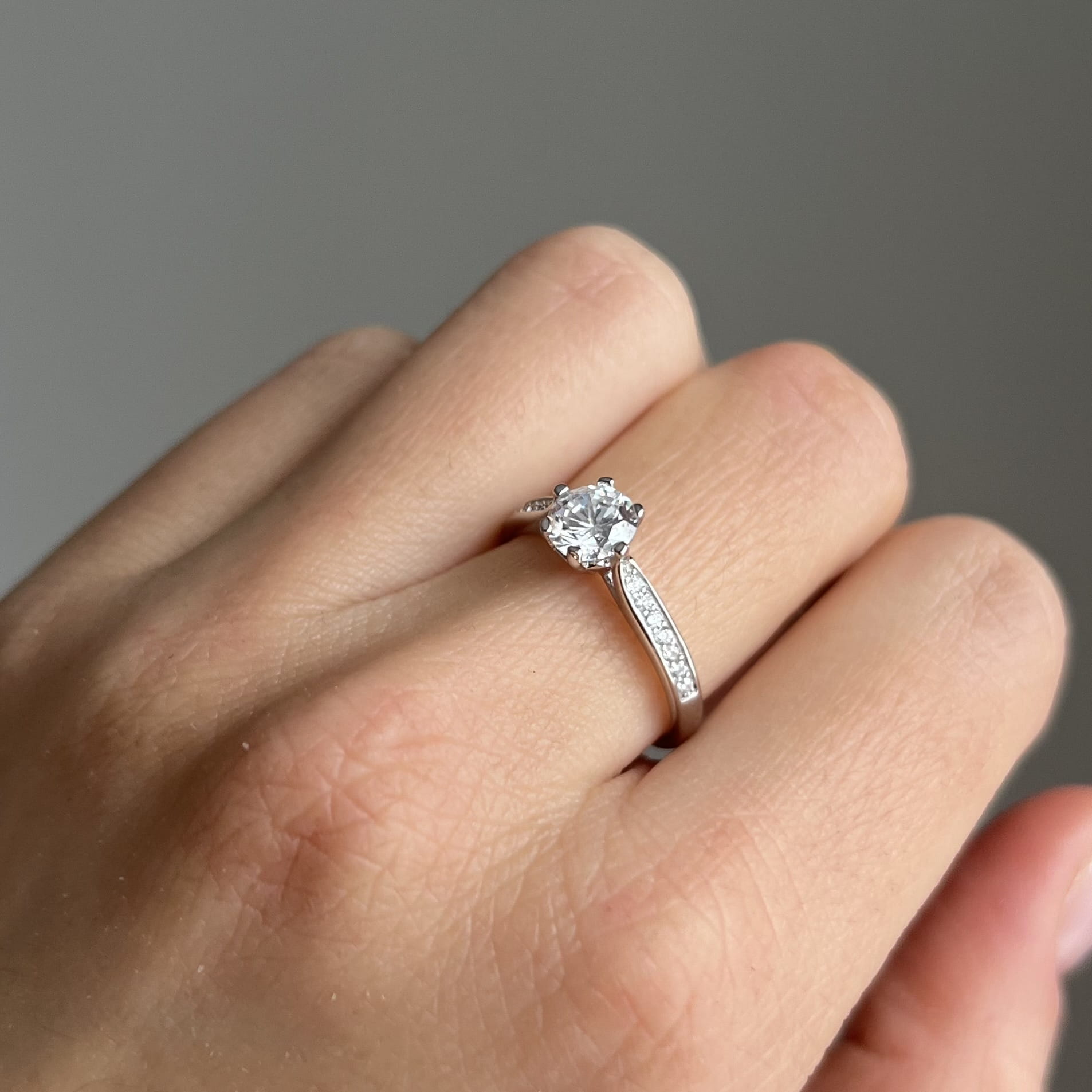 W centrum pierścionka znajduje się cyrkonia o średnicy 6 mm, która pięknie rozprasza światło i stanowi główny akcent modelu. Dodatkowe drobne cyrkonie umieszczone po bokach podkreślają jego blask, tworząc efekt biżuterii o wysokiej elegancji.