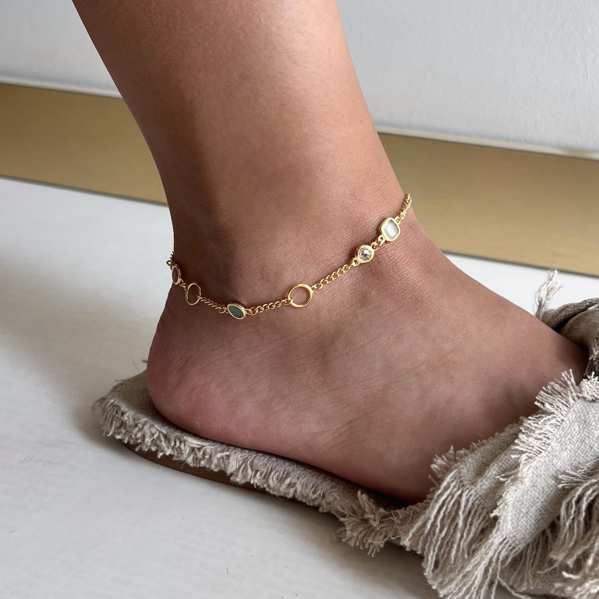 Srebrna pozłacana bransoletka na kostkę KOLOROWA odcień pistacja z maliną