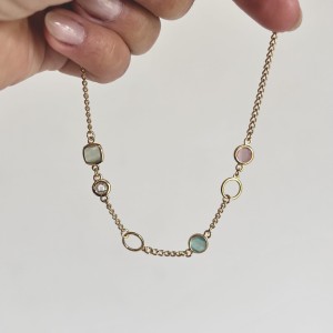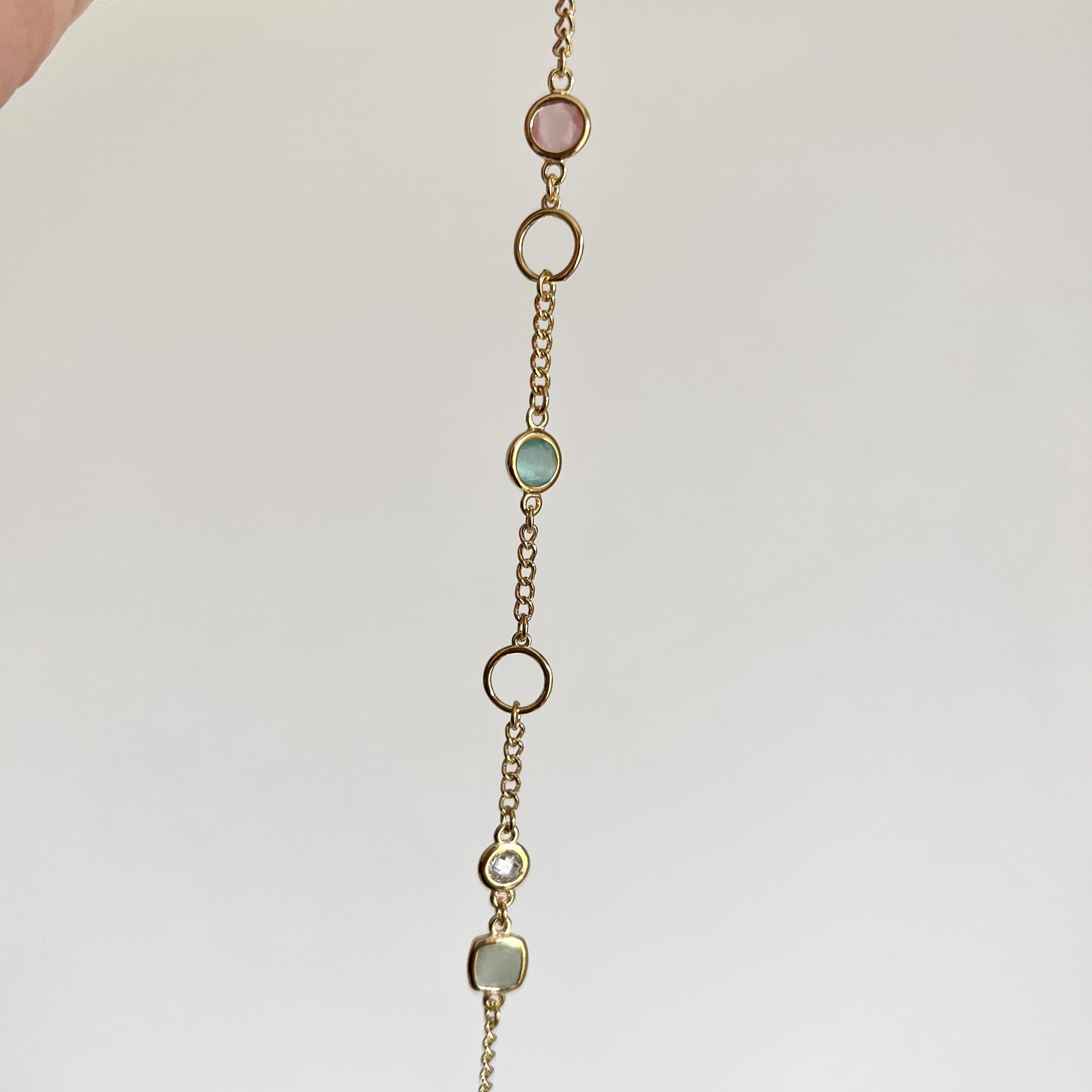 Podkreśl swój letni styl z srebrną pozłacaną bransoletką na kostkę ozdobioną różową i zieloną cyrkonią. Delikatne, kolorowe kamienie dodają biżuterii wyjątkowego uroku, a złocenie 24-karatowym złotem nadaje jej subtelnej elegancji.