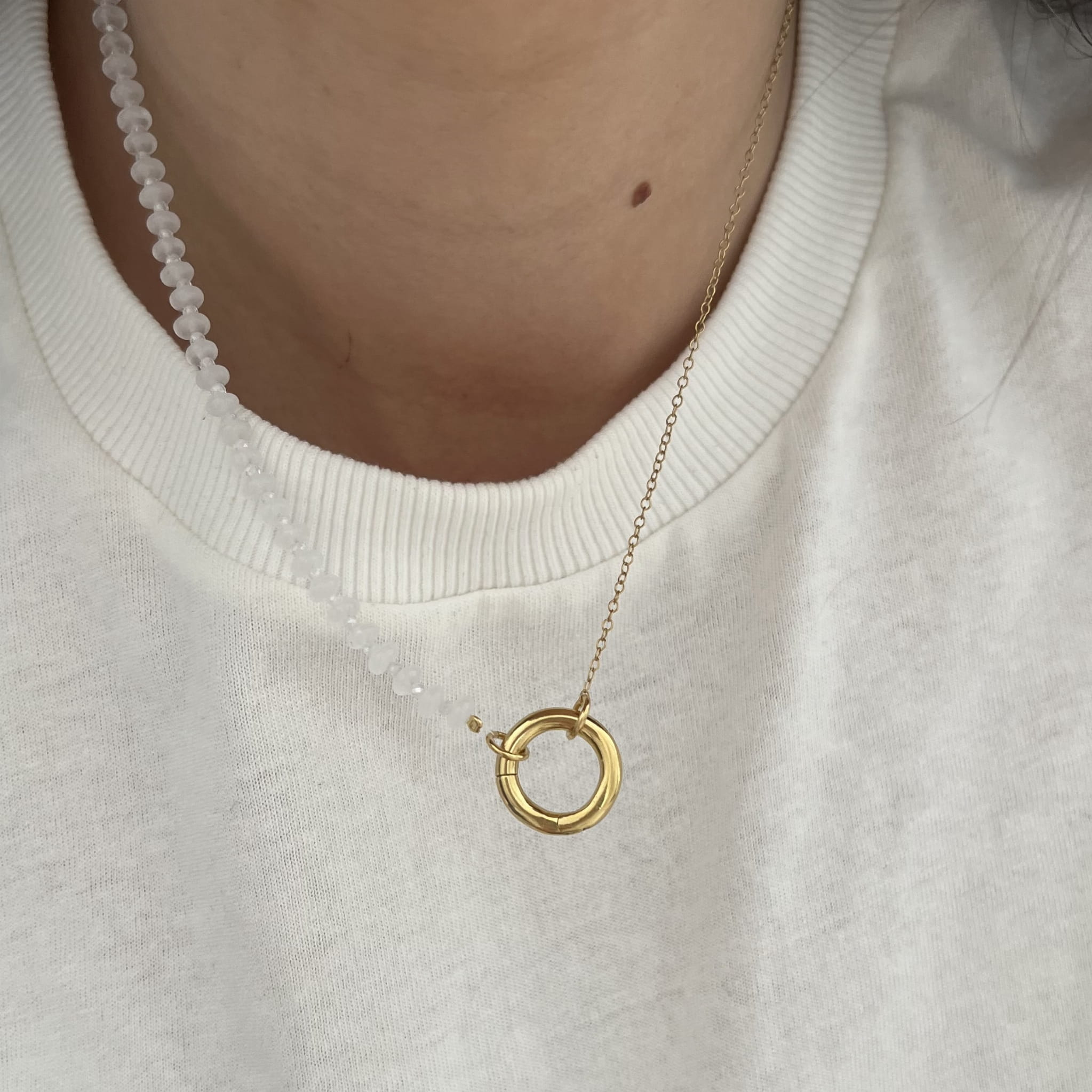 Głównym elementem kompozycji są naturalne jadeity w odcieniu kokosowym – subtelne, kremowe kamienie o delikatnym połysku. Ich naturalna faktura i kolor sprawiają, że naszyjnik doskonale komponuje się z codziennymi i eleganckimi stylizacjami.