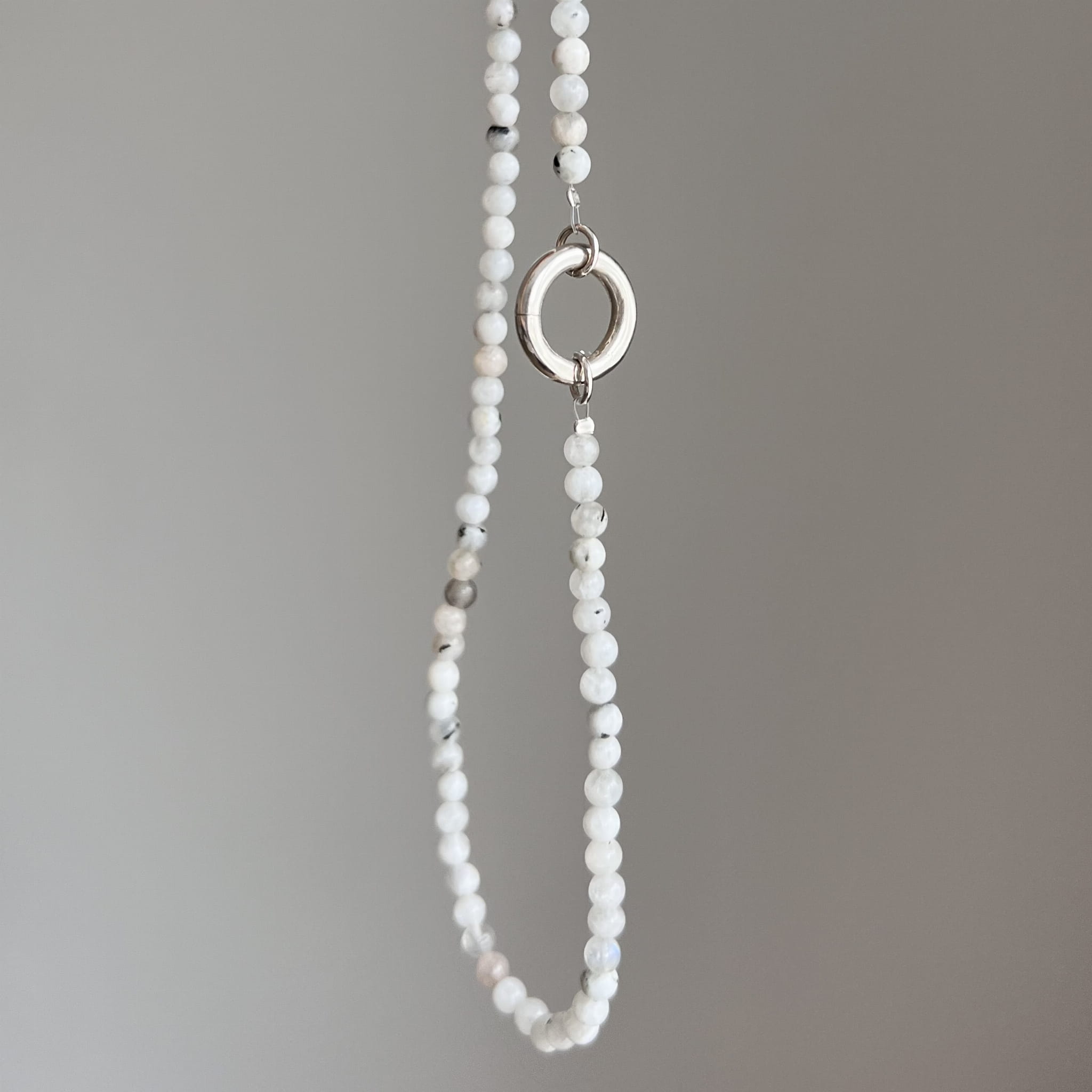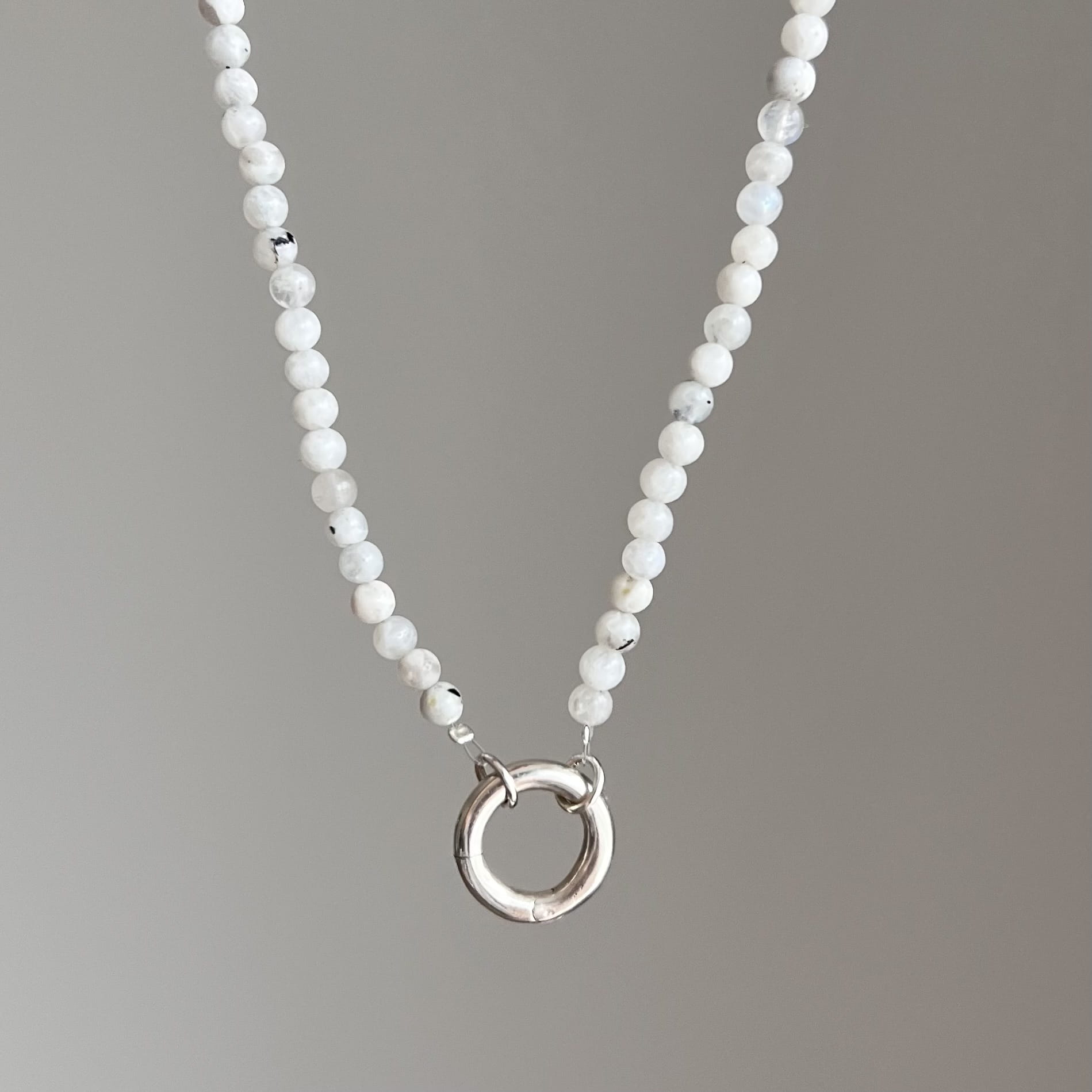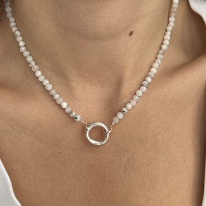 Naszyjnik ZAPIĘCIE KOŁO kamień księżycowy PEŁNIA kamienie naturalne biały wykończony srebrnym zapięciem w formie koła. Naturalne kamienie w odcieniu mlecznej bieli dostępny w wersji srebrnej lub srebrne pozłacanej 24 karatowym złotem
