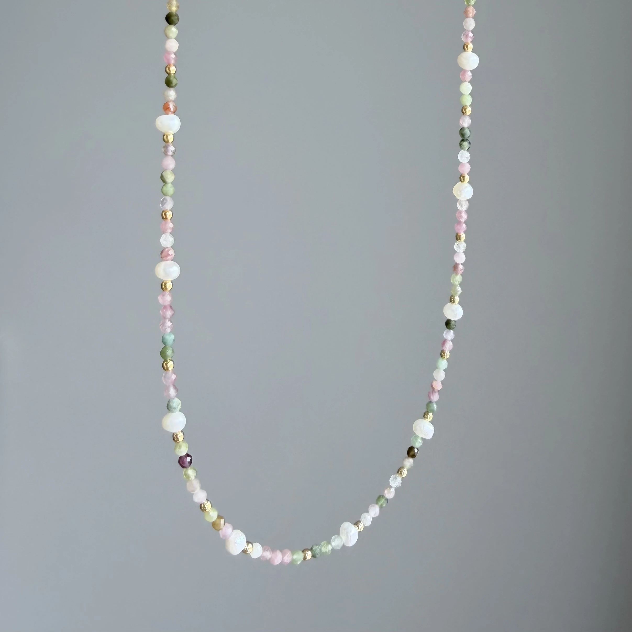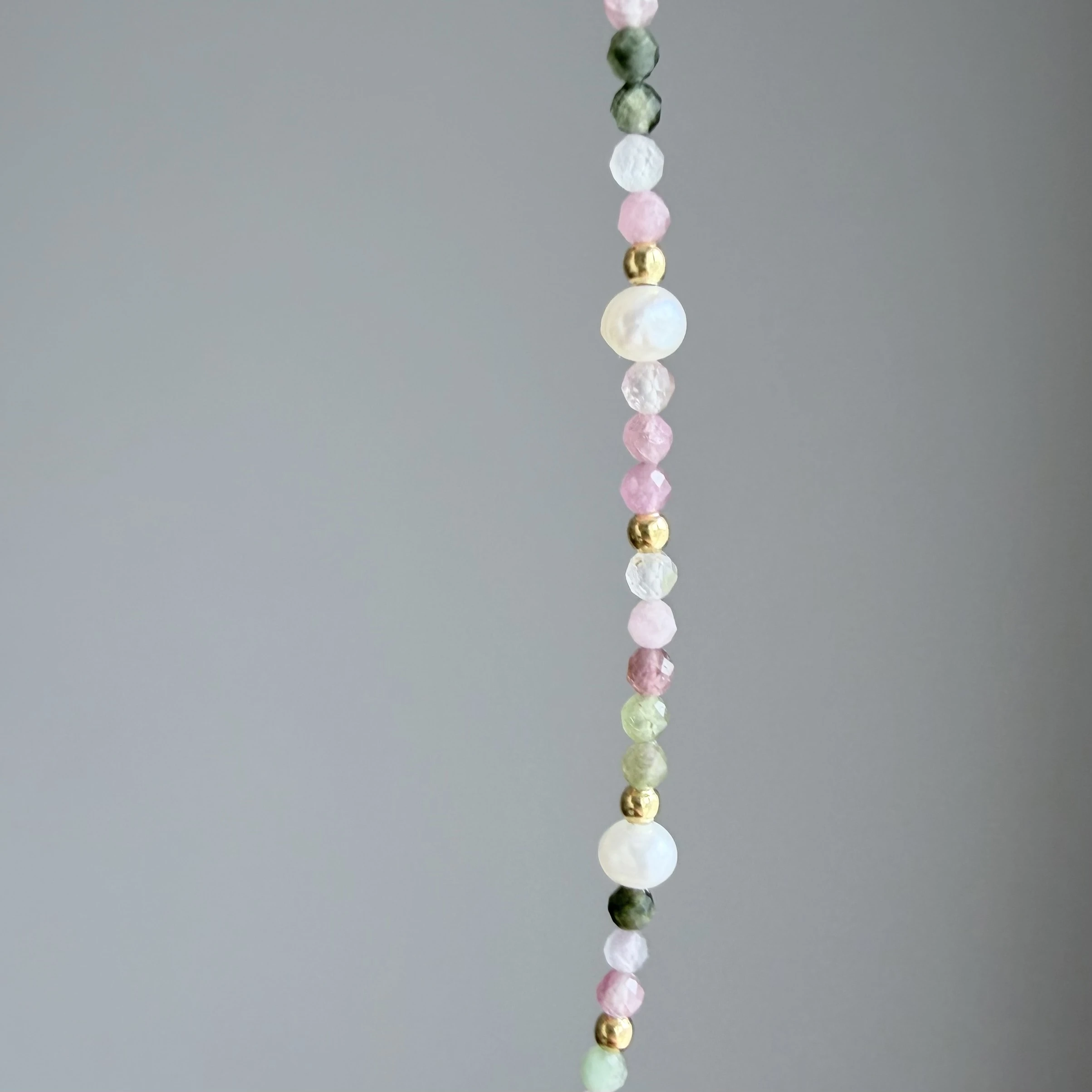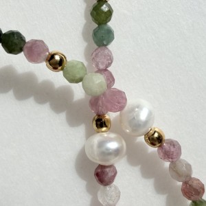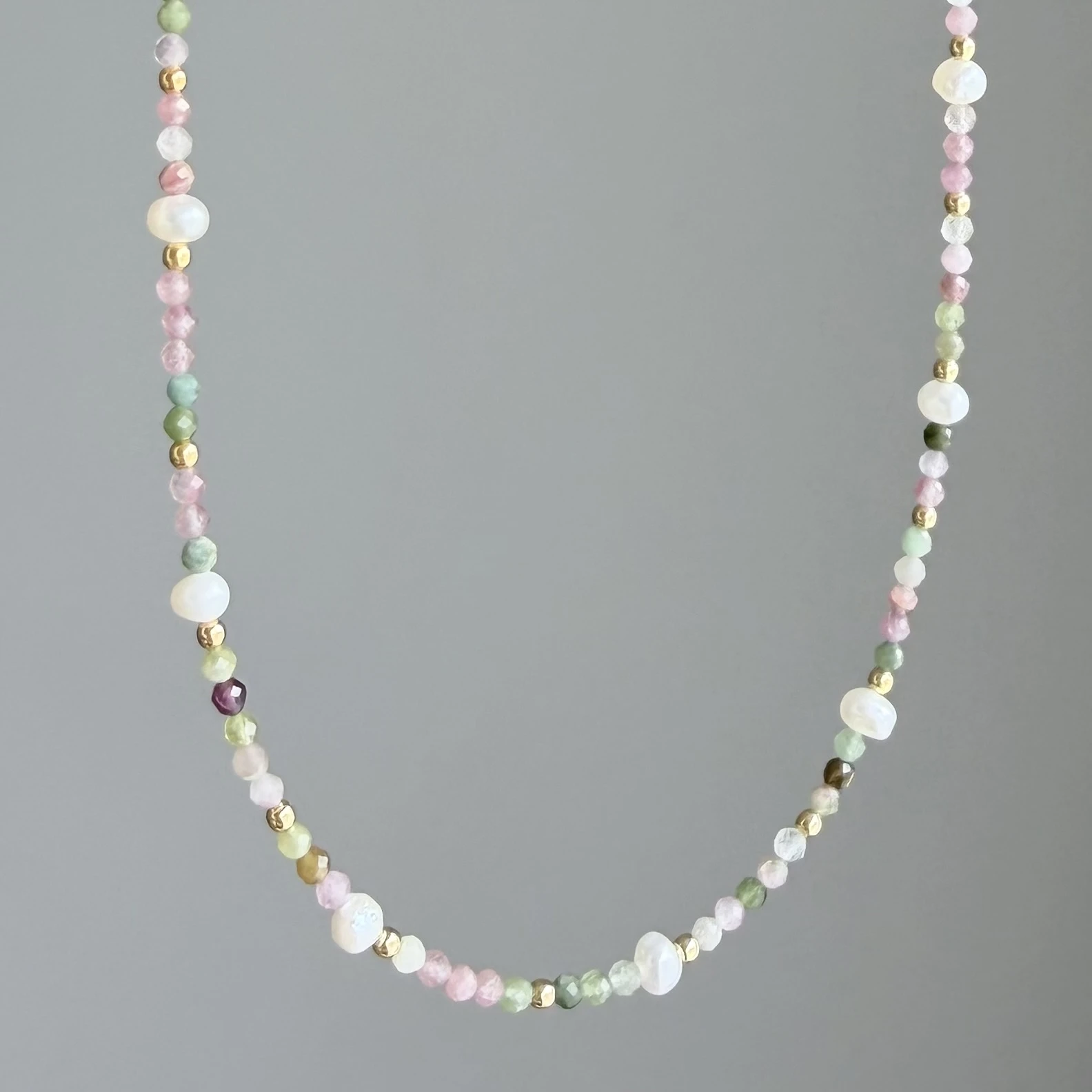 Połączenie turmalinu i pereł tworzy kompozycję, która wygląda lekko, świeżo i bardzo kobieco. To naszyjnik, który pięknie dopełnia codzienne stylizacje, ale równie dobrze sprawdzi się przy bardziej dopracowanych zestawach. Możesz nosić go solo, kiedy chcesz postawić na naturalny i subtelny akcent, albo zestawić z innymi delikatnymi łańcuszkami, tworząc spójną, warstwową stylizację.