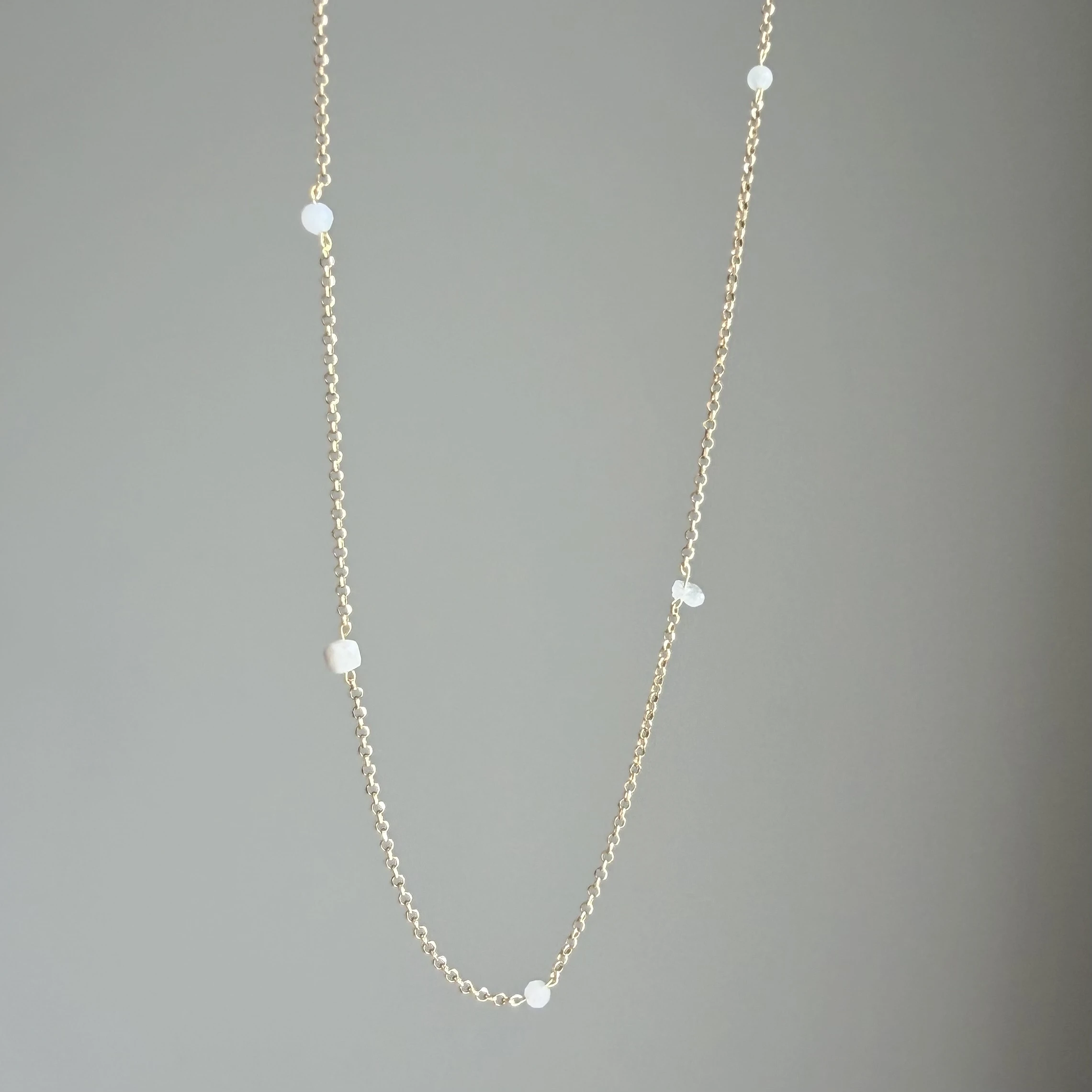 W naszyjniku zostały wykorzystane takie kamienie jak chalcedon błękitny, agat, kryształ górski, morganit oraz rodonit, które razem tworzą lekką, kobiecą i wyjątkowo estetyczną całość. To biżuteria, która pięknie dopełnia stylizację i dodaje jej naturalnego uroku. Model Peonia doskonale sprawdzi się zarówno na co dzień, jak i jako subtelny akcent do bardziej romantycznych czy eleganckich zestawów.
