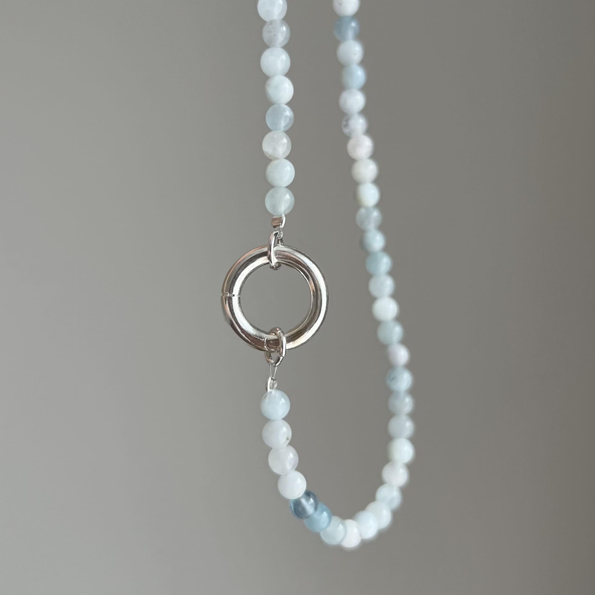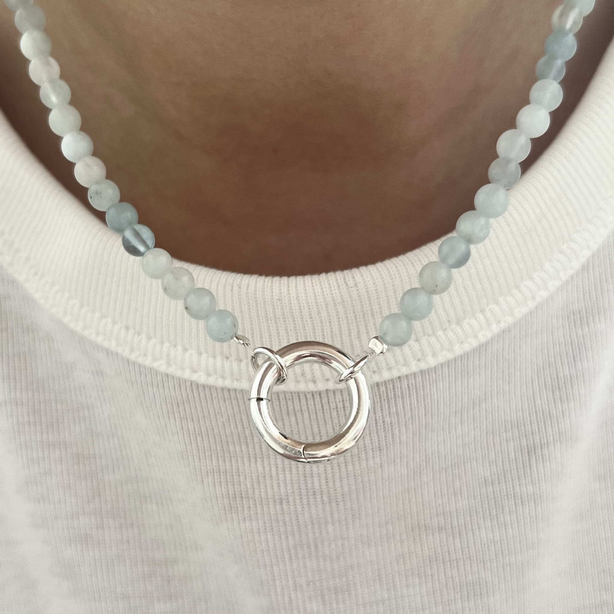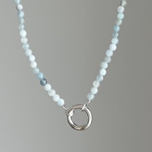 Naszyjnik z naturalnego akwamarynu w odcieniu spokojnego błękitu. Zakończony charakterystycznym zapięciem w formie koła dostępny w wersji srebrnej lub srebrne pozłacanej 24 karatowym złotem