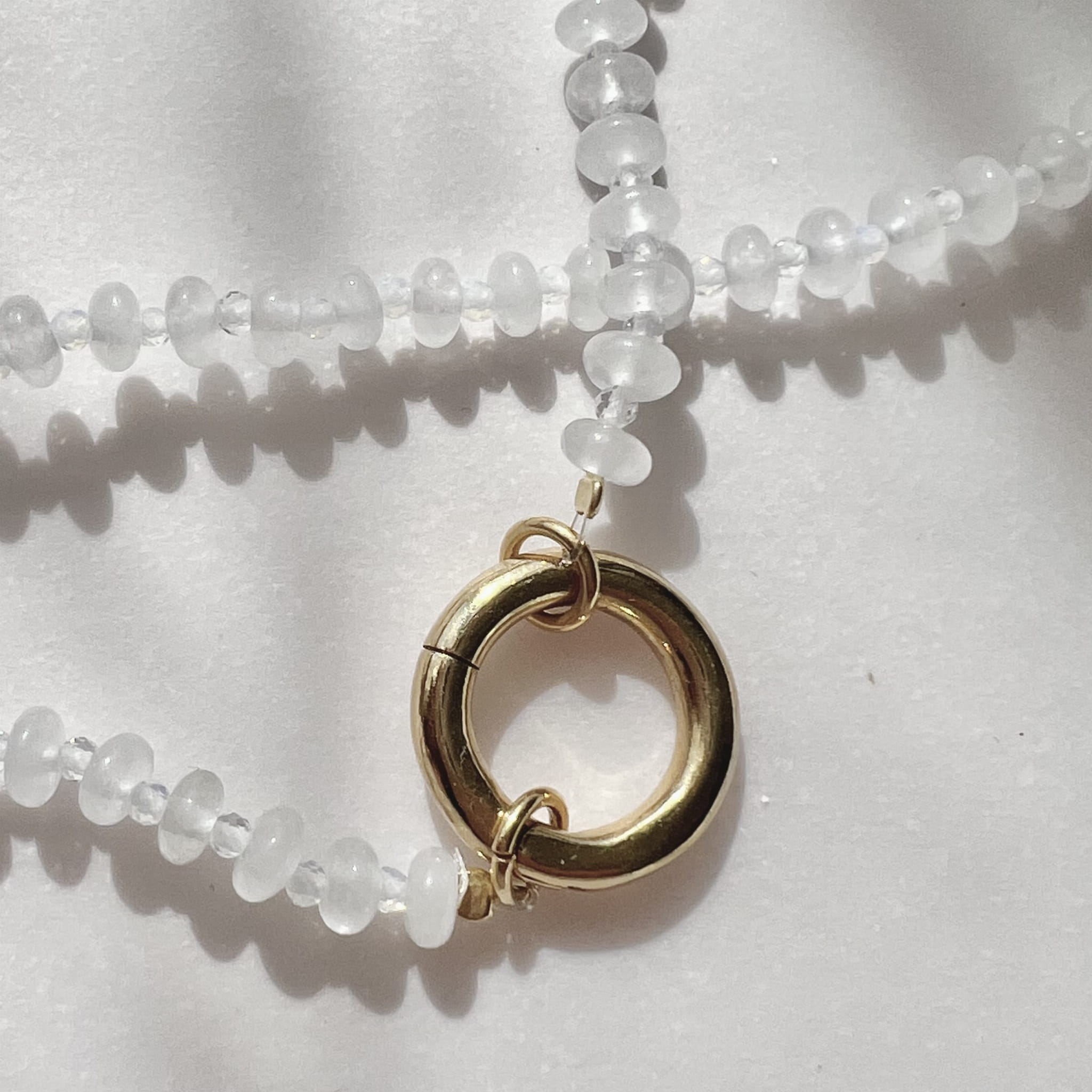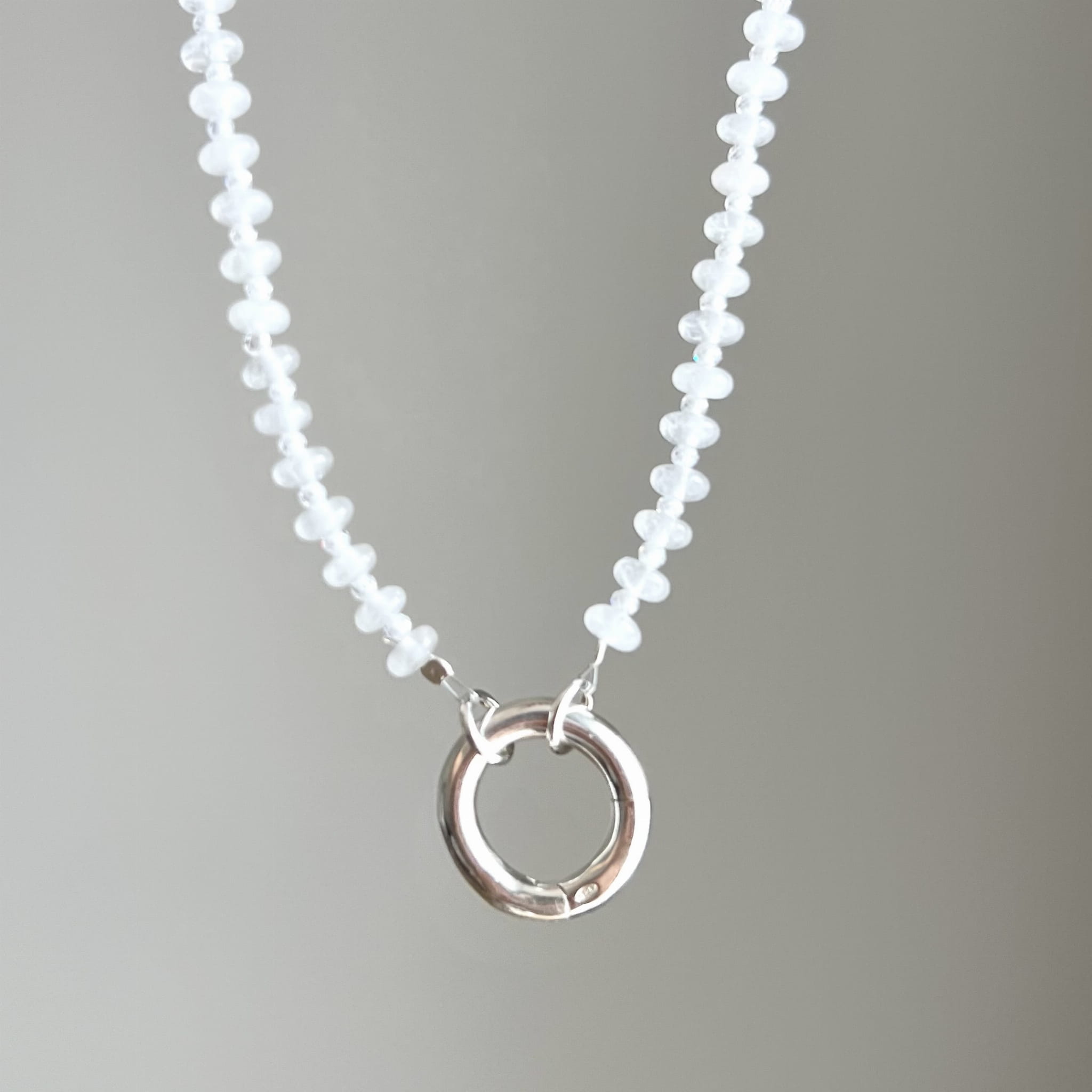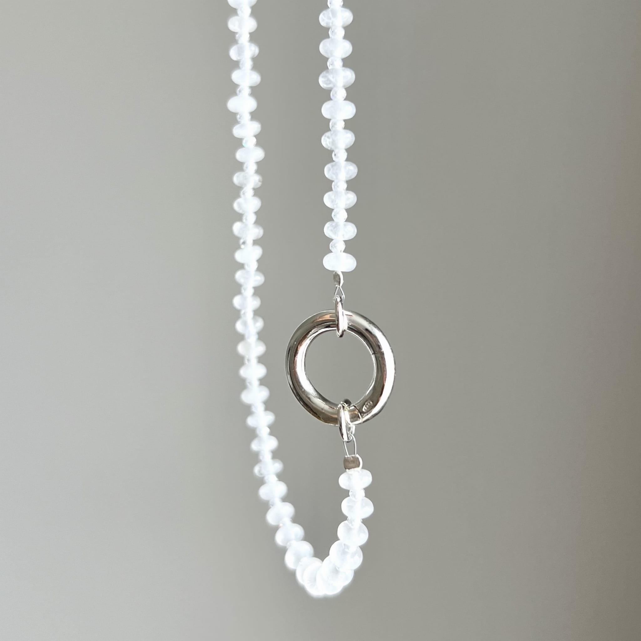 Naszyjnik z białego jadeitu, wykończony srebrnym zapięciem w formie koła. Naturalne kamienie w odcieniu mlecznej bieli dostępny w wersji srebrnej lub srebrne pozłacanej 24 karatowym złotem