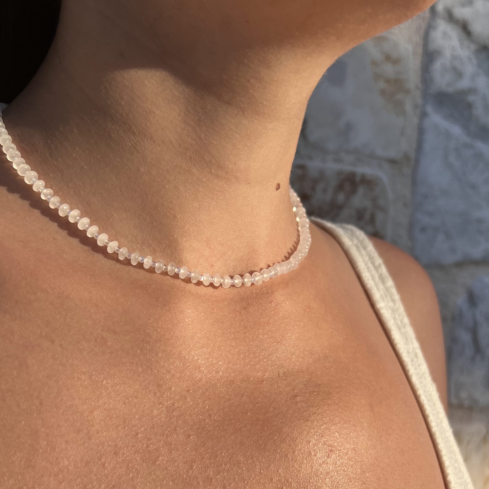 Ten naszyjnik został wykonany z naturalnych kamieni jadeitu w odcieniu mlecznej bieli, które emanują spokojem, czystością i delikatnością. Jasny kolor sprawia, że biżuteria jest wyjątkowo uniwersalna – doskonale komponuje się z codziennymi stylizacjami, ale też z eleganckimi zestawami na specjalne okazje.