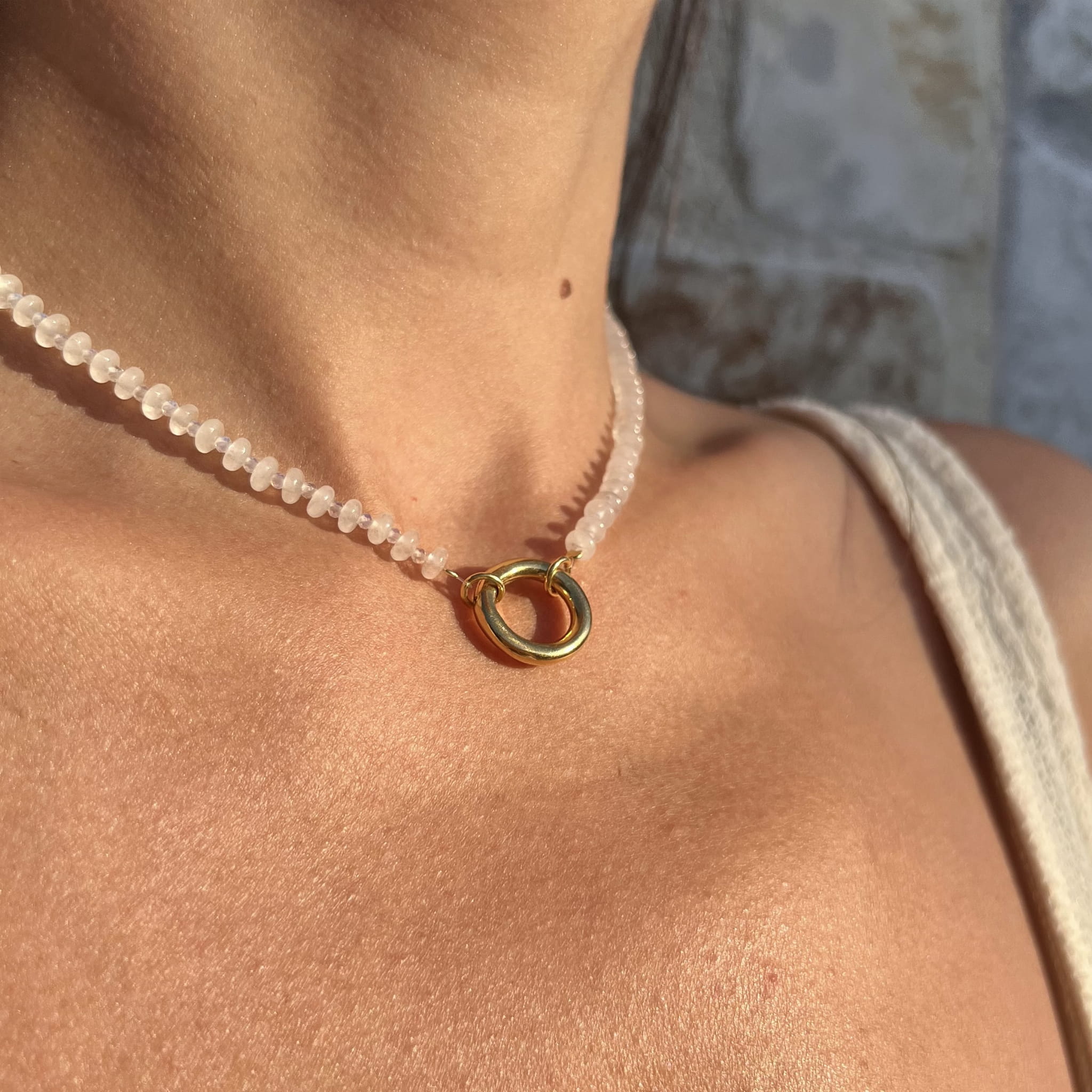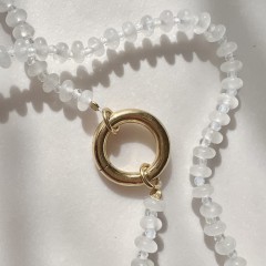 Naturalne kamienie o mlecznym wykończeniu i ozdobne zapięcie w kształcie koła. Noś go klasycznie lub z charakterem – zapięcie z przodu. Dostępny w srebrze i w wersji pozłacanej.
