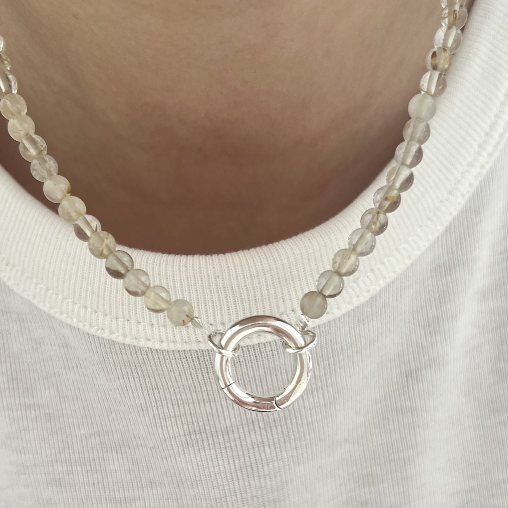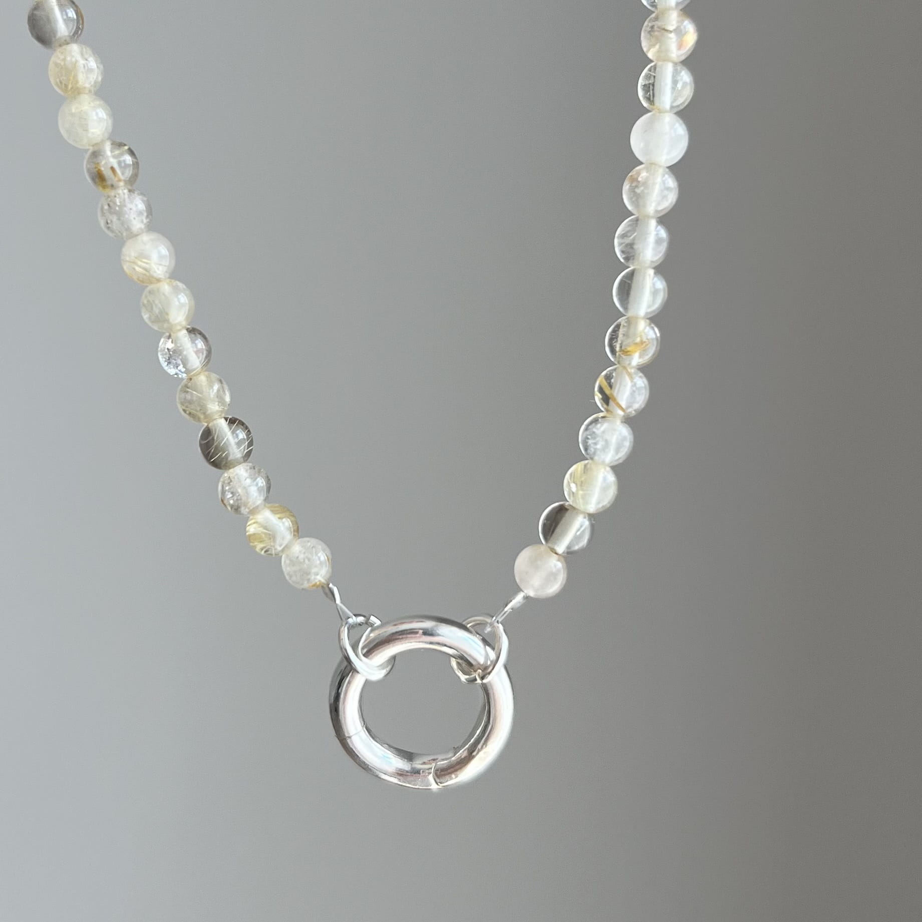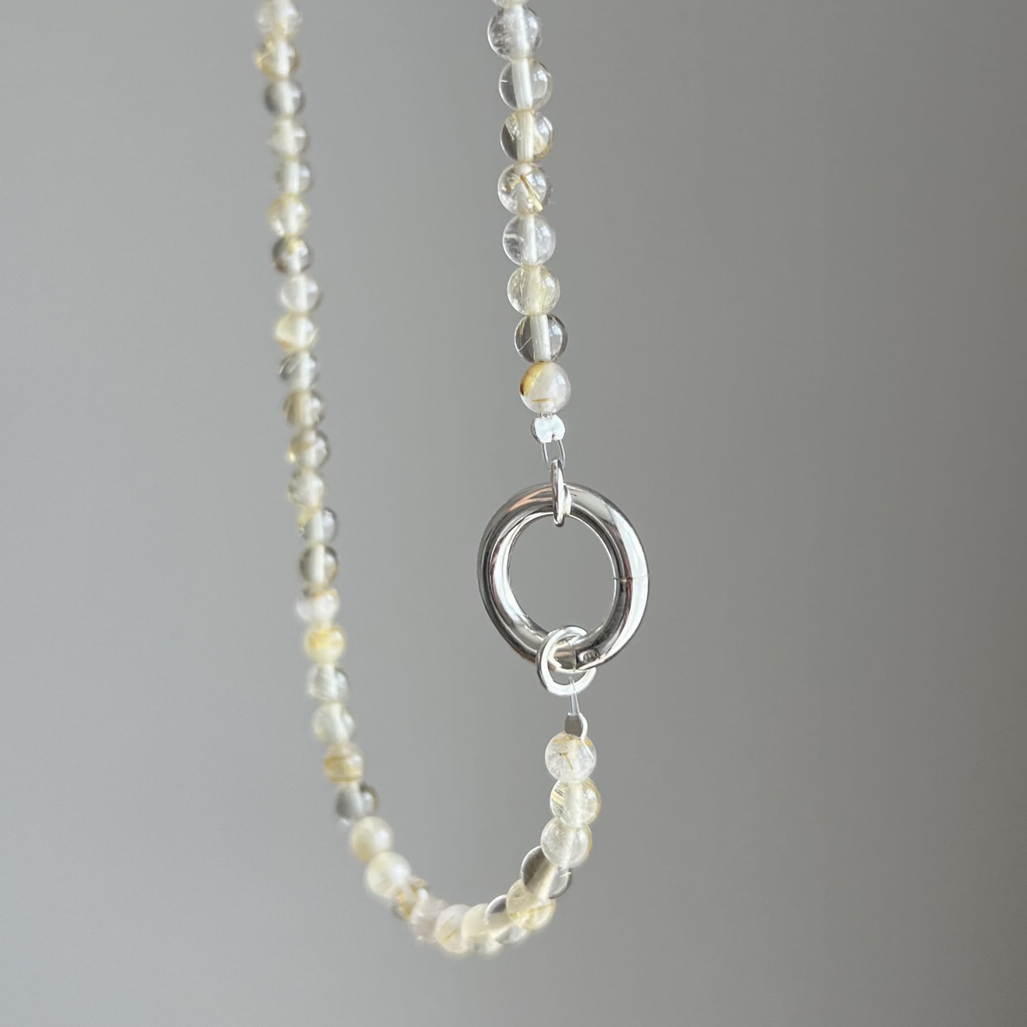 Naszyjnik z kul kwarcu rutylowego ze złotą nitką. Wykończony zapięciem w formie koła ze srebra pozłacanego dostępny w wersji srebrnej lub srebrne pozłacanej 24 karatowym złotem