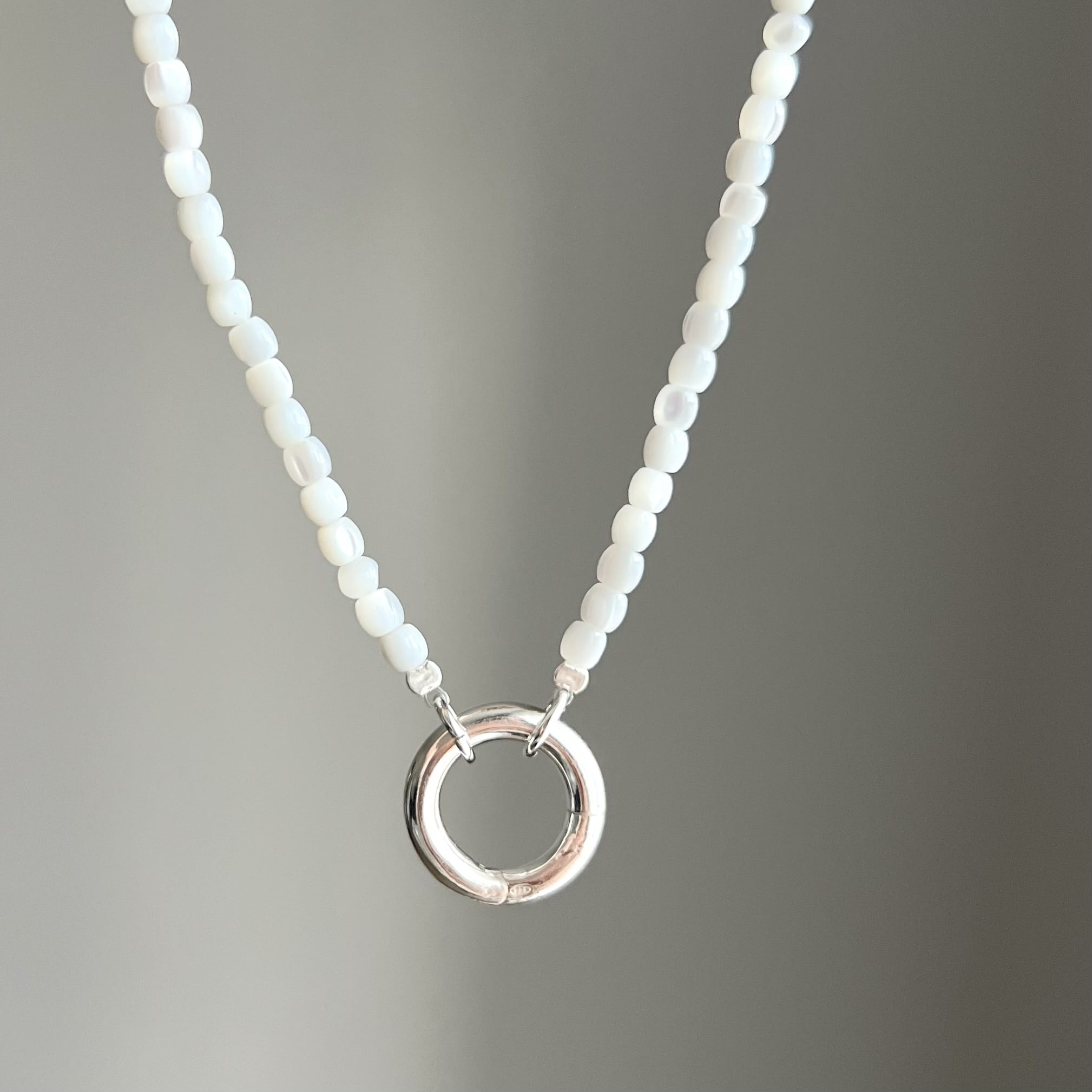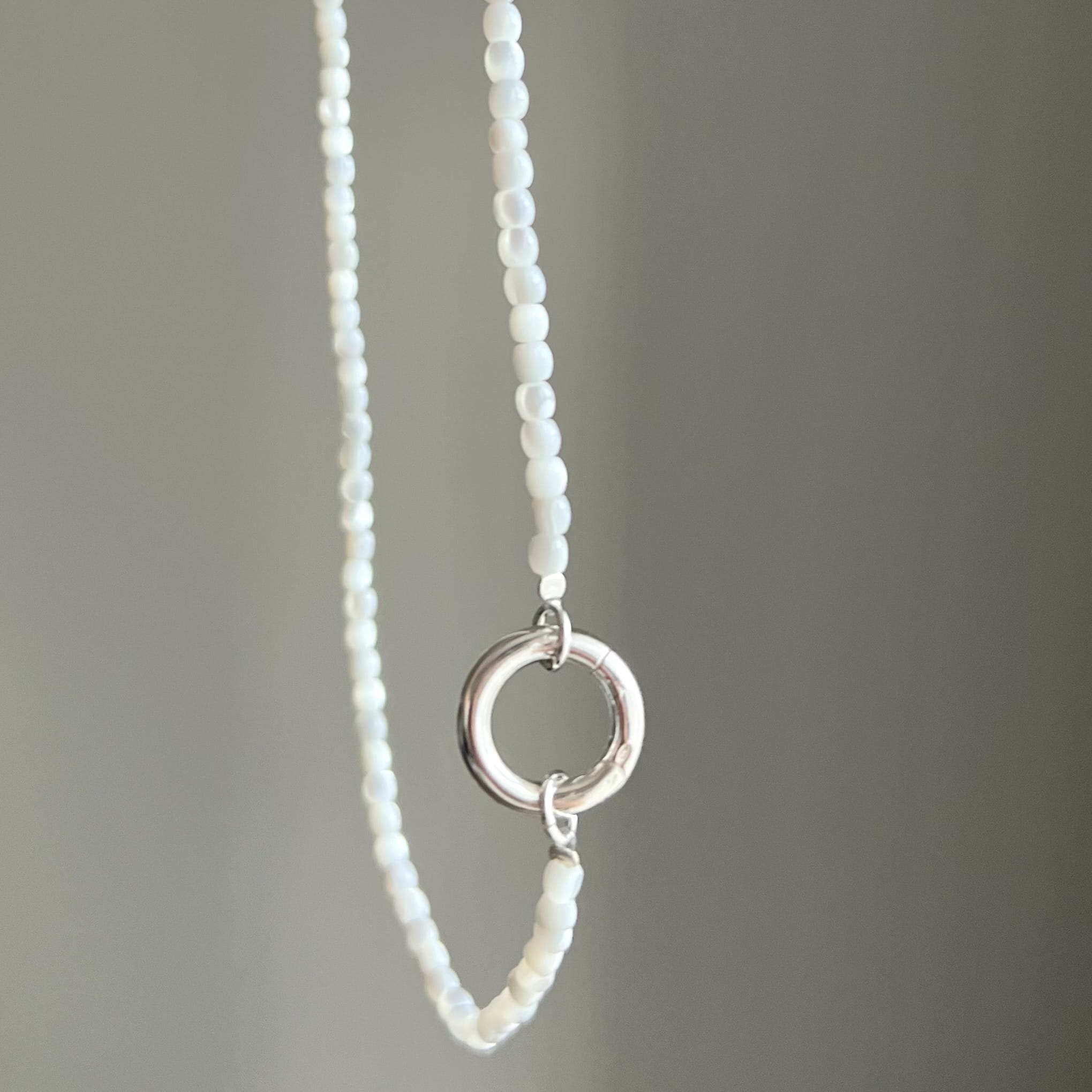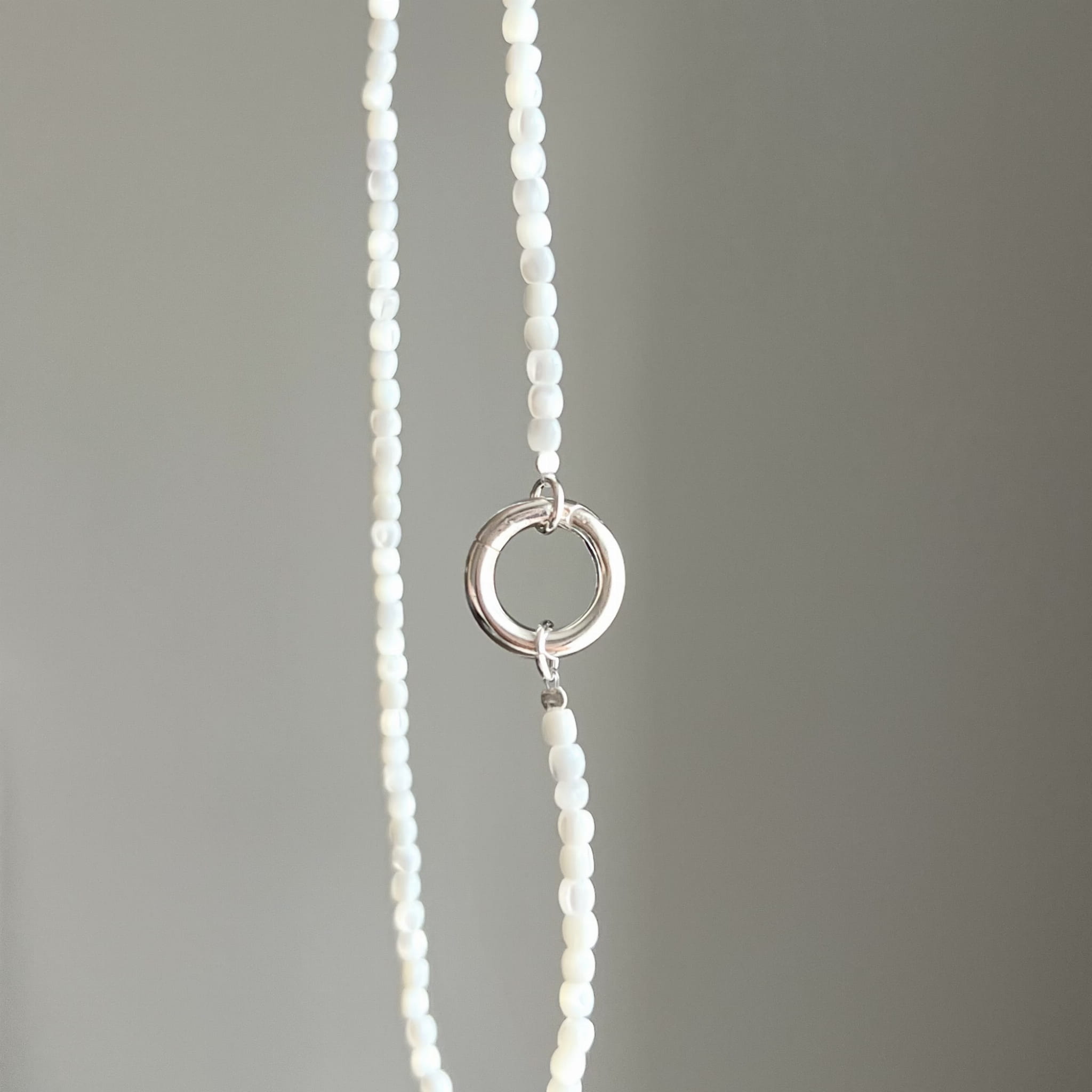 Naszyjnik z masy perłowej o mlecznobiałym połysku, wykonany z naturalnych komponentów.Wykończony charakterystycznym zapięciem w formie koła dostępny w wersji srebrnej lub srebrne pozłacanej 24 karatowym złotem