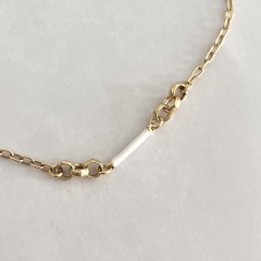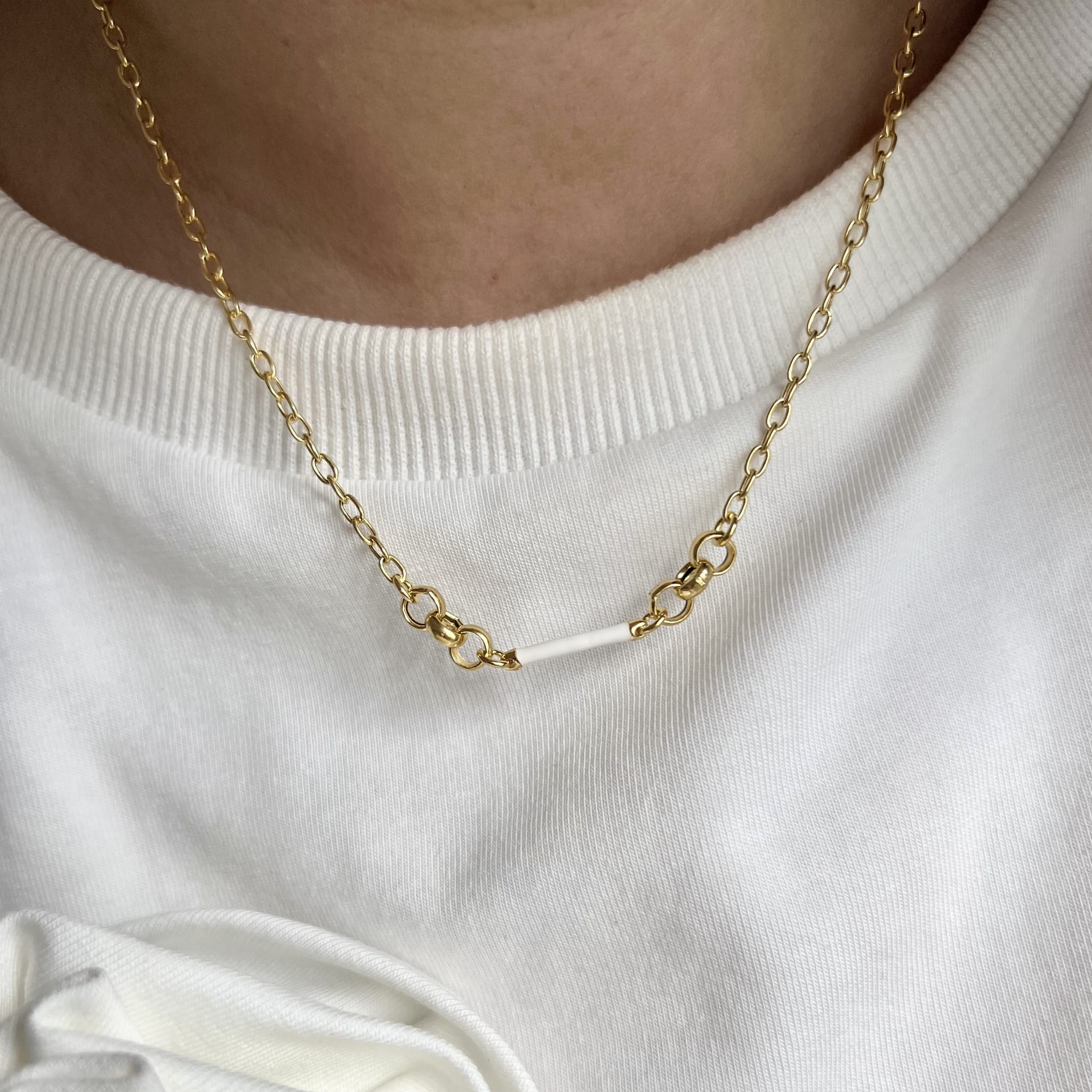 Element ozdobny naszyjnika to bielona emalia jubilerska, która nadaje mu subtelny i nowoczesny charakter. Regulowana długość 40-45 cm sprawia, że idealnie dopasowuje się do każdej sylwetki.