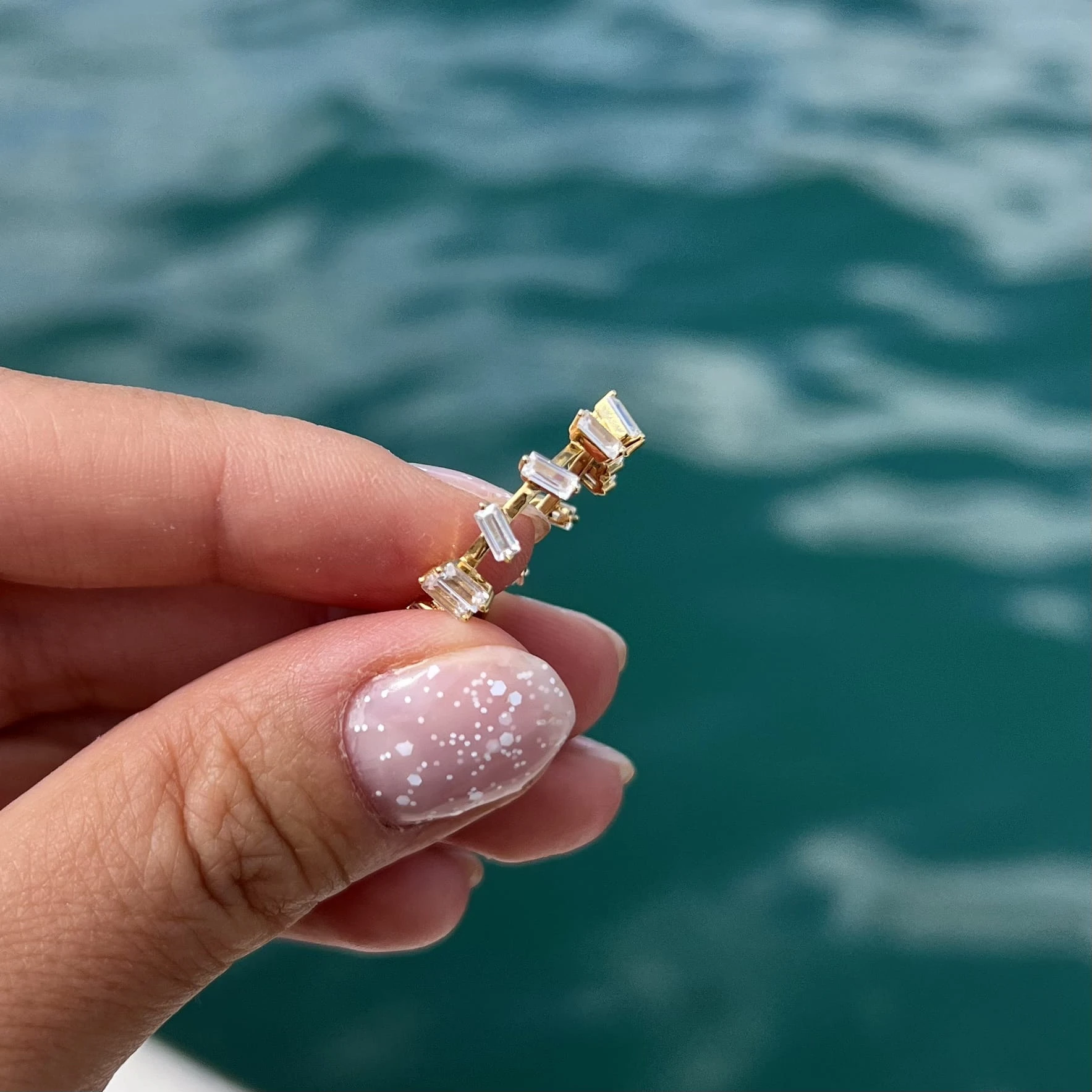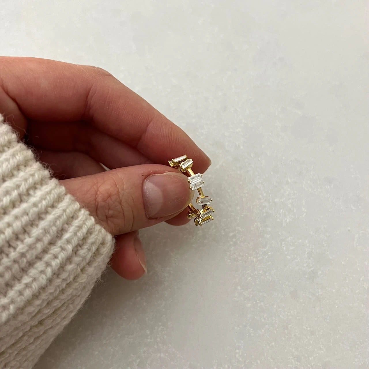 Ten model pięknie wygląda solo, ale możesz też połączyć go z cienką obrączką albo delikatną bransoletką z cyrkoniami, żeby stworzyć elegancką i bardzo kobiecą całość.