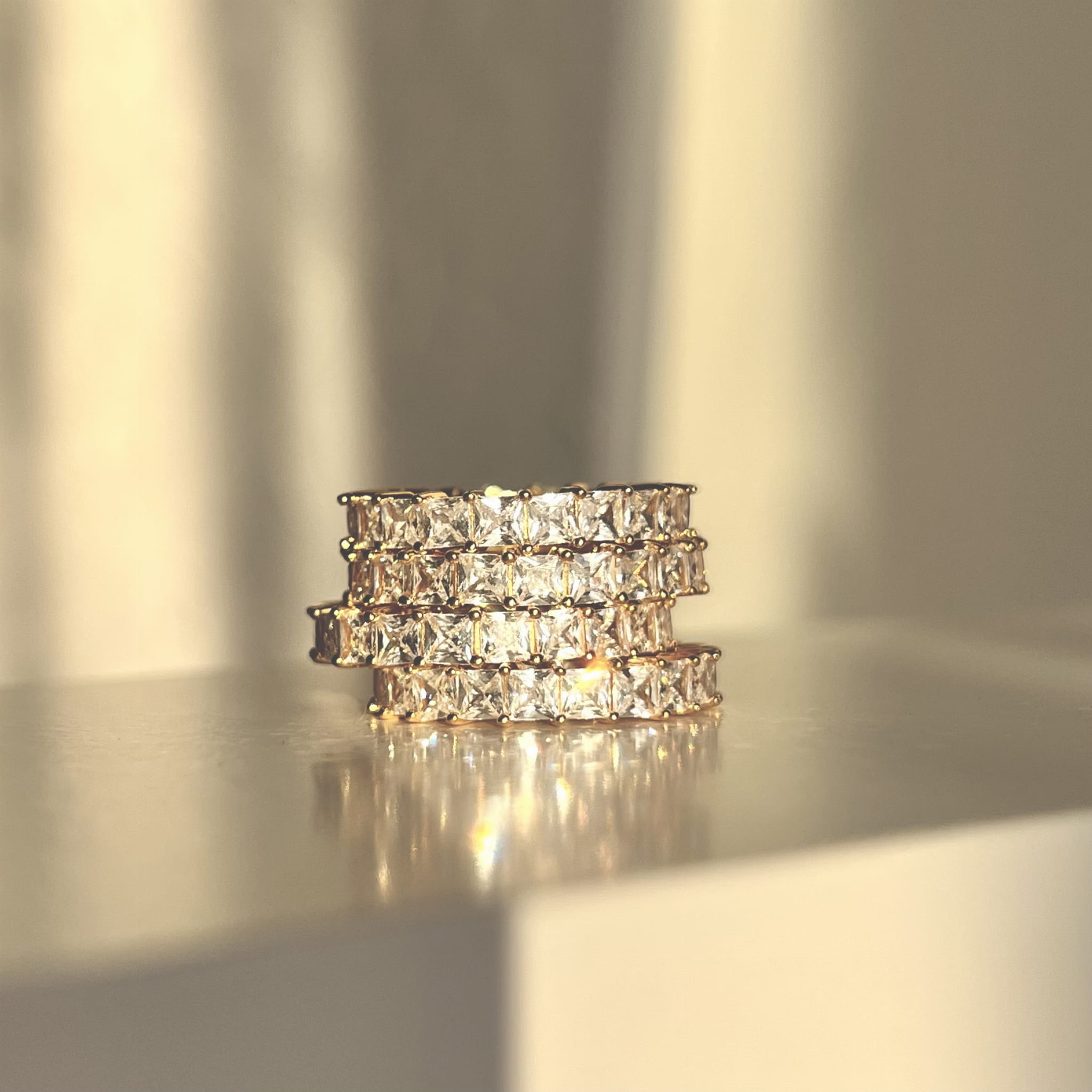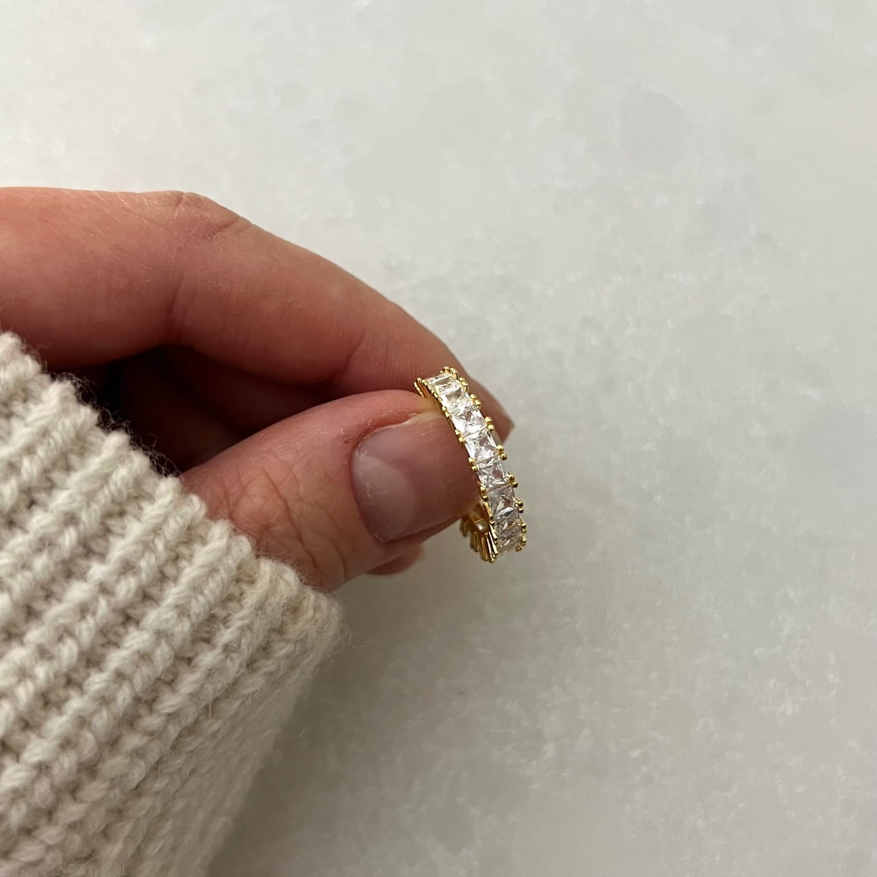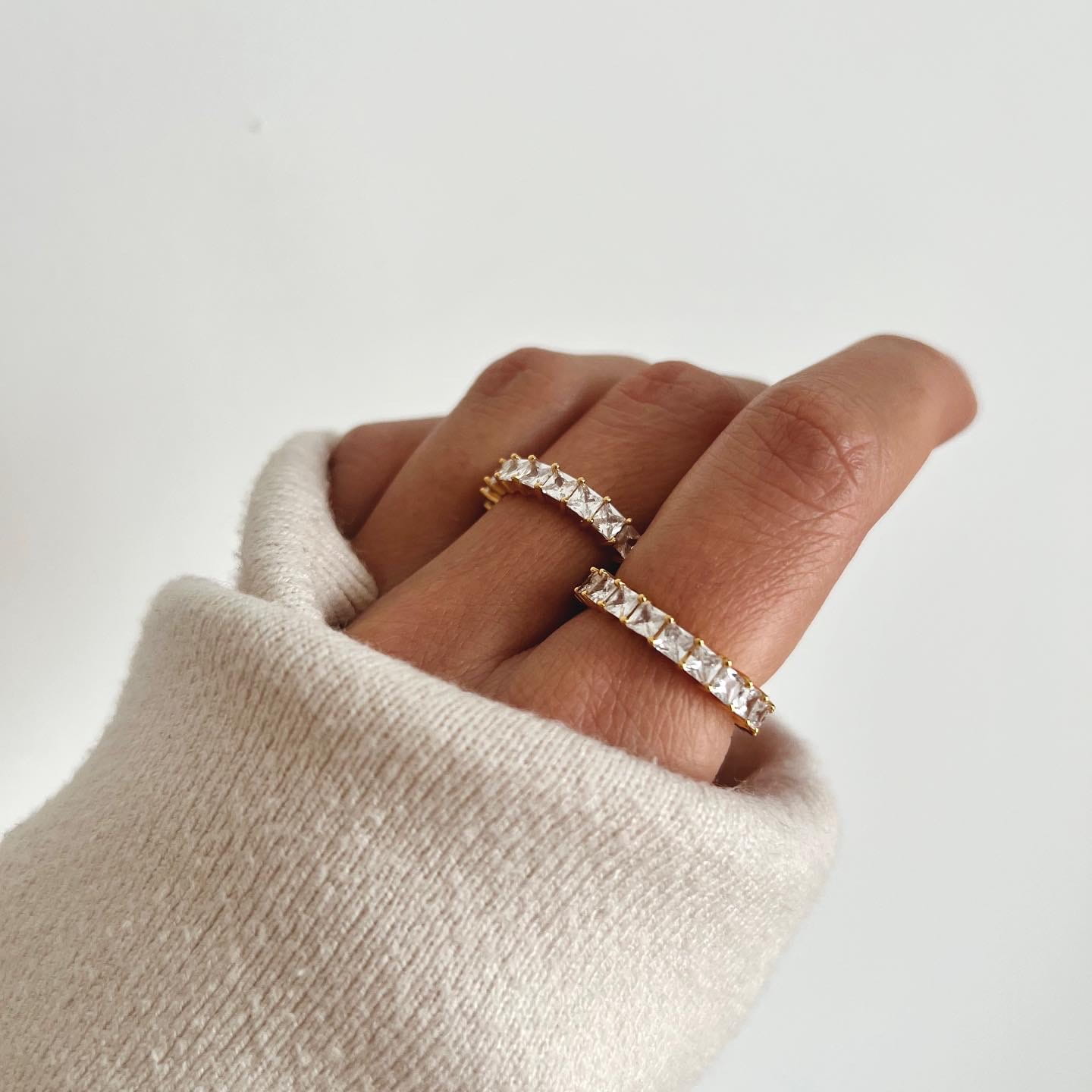 Pozłacany pierścionek obrączka z cyrkoniami KWADRAT to ponadczasowa biżuteria, która łączy klasykę z nowoczesnym akcentem. Wykonany z najwyższej jakości srebra próby 925 i pokryty 24-karatowym złotem, zachwyca eleganckim blaskiem i subtelnym wzorem. Cyrkonie o kwadratowym szlifie pięknie odbijają światło, nadając biżuterii luksusowego charakteru. Jego szerokość 2,20 mm sprawia, że jest wygodny i doskonale prezentuje się zarówno solo, jak i w połączeniu z innymi pierścionkami. Hipoalergiczny, bez niklu, zapewnia komfort noszenia na co dzień. Zapakowany w eleganckie pudełko i torebkę, idealnie nadaje się na prezent dla miłośniczek stylowej i ponadczasowej biżuterii.