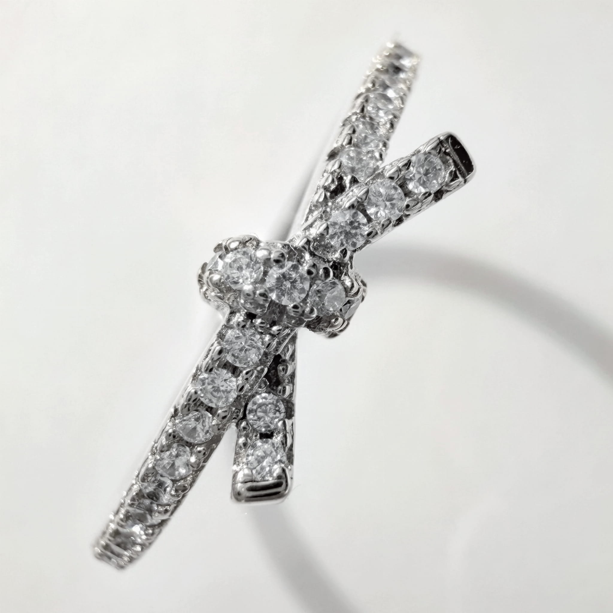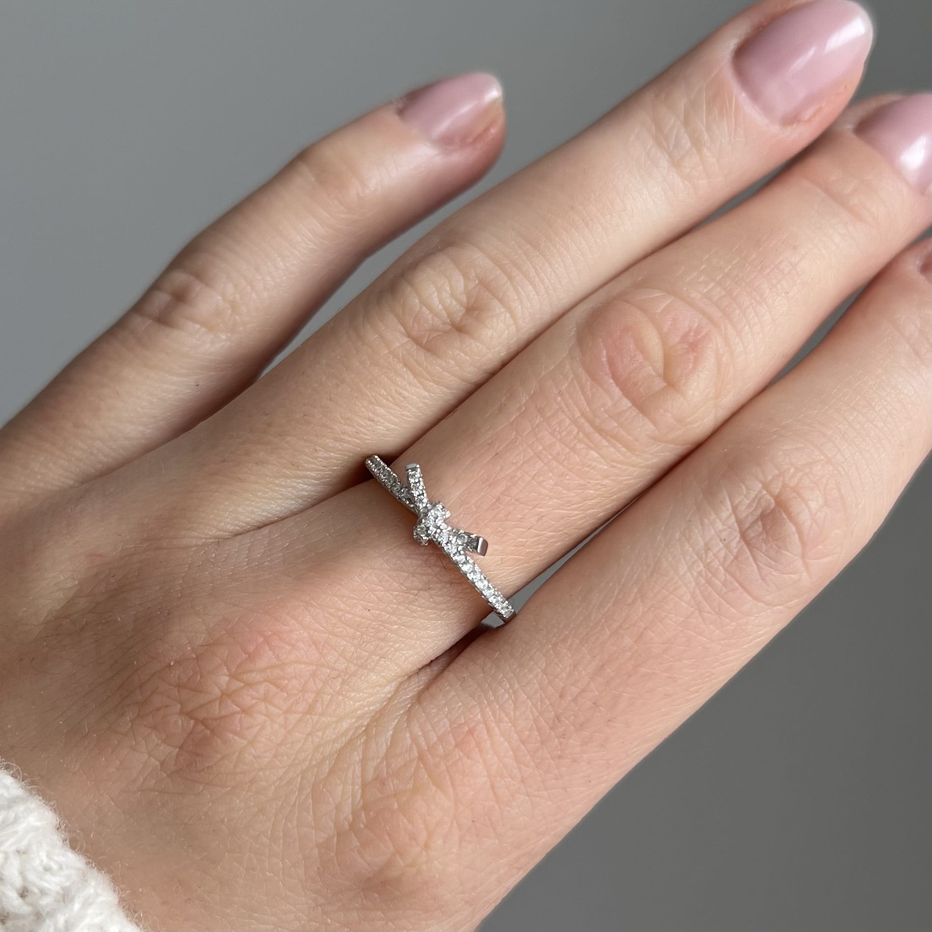 Element ozdobny w kształcie kokardki, wysadzany lśniącymi cyrkoniami, dodaje pierścionkowi lekkości i dziewczęcego charakteru, nie tracąc przy tym elegancji. Szerokość modelu to 4,6 mm, a masa ok. 1,70 g, dzięki czemu pierścionek jest wygodny i odpowiedni do codziennego noszenia.