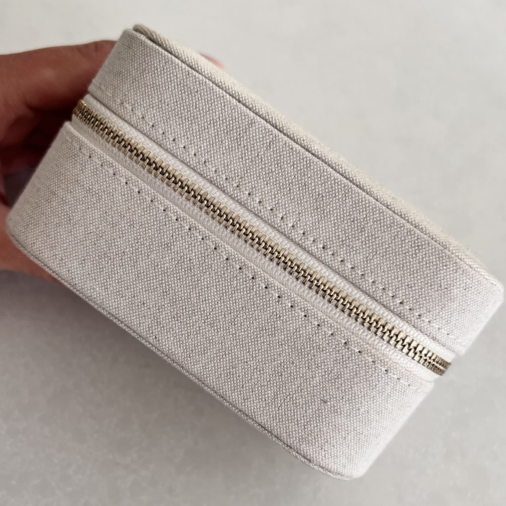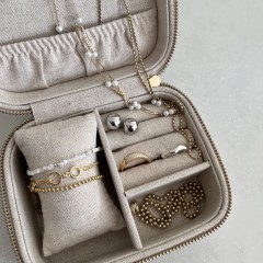 Wykonana z 100% lnu miłego w dotyku materiału w pięknym kremowym kolorze. Posiada specjalnie wyprofilowane przegródki na pierścionki, kolczyki, bransoletki i łańcuszki. Koniec z poplątanymi łańcuszkami i zarysowaniami.