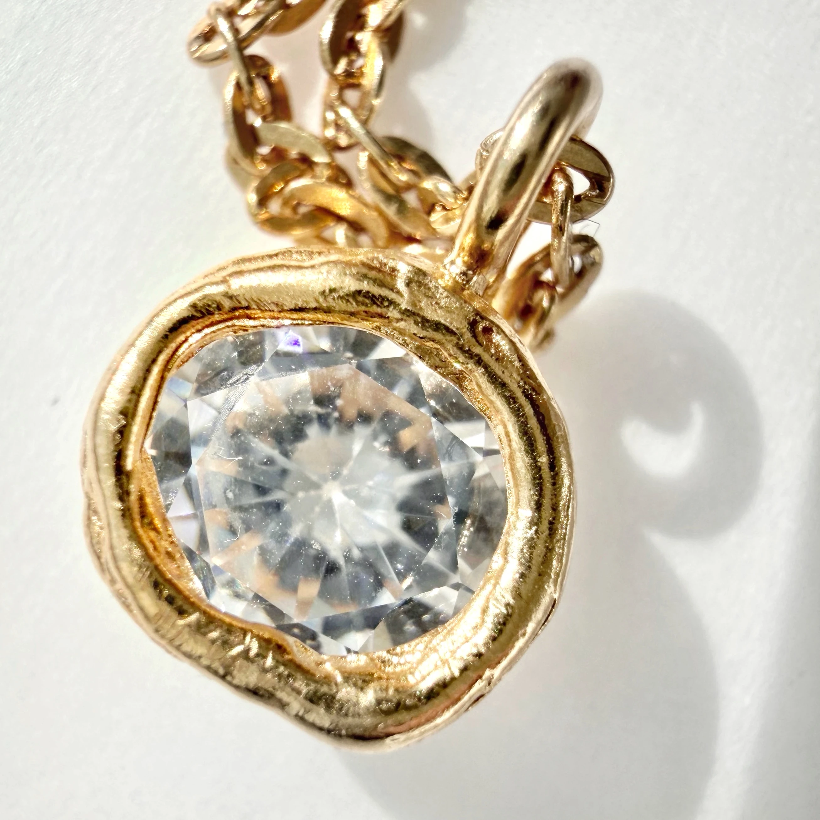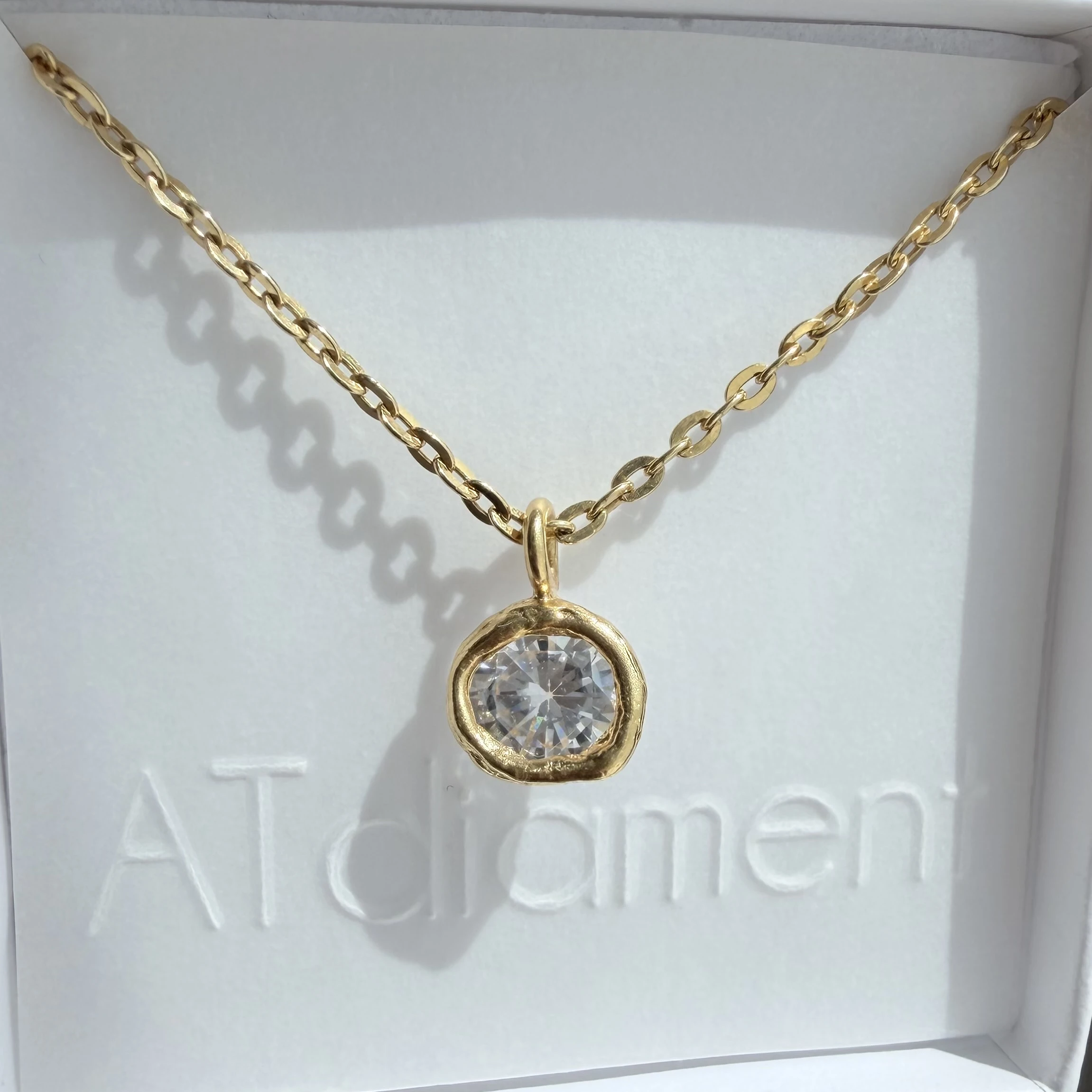 Naszyjnik został wykonany w całości ze srebra najwyższej próby 925 i pokryty 24-karatowym złotem, dzięki czemu zachwyca szlachetnym wykończeniem oraz ciepłym, eleganckim odcieniem. Delikatna cyrkonia nie dominuje formy, ale pięknie ją podkreśla, dodając całości światła i kobiecego charakteru.
