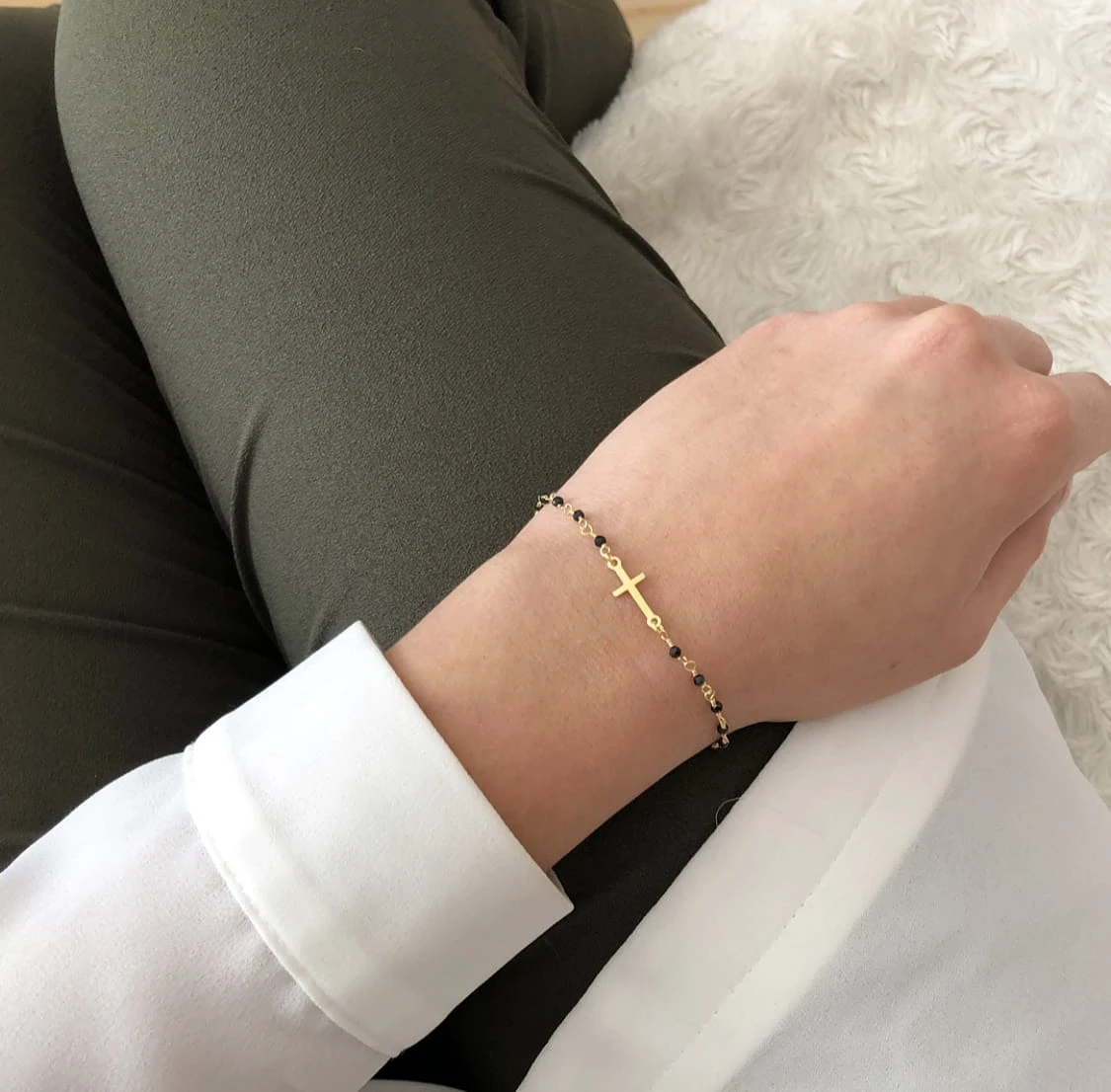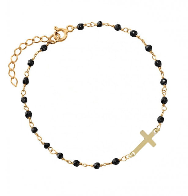 Srebrna pozłacana bransoletka z czarnymi onyksami krzyżyk