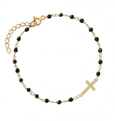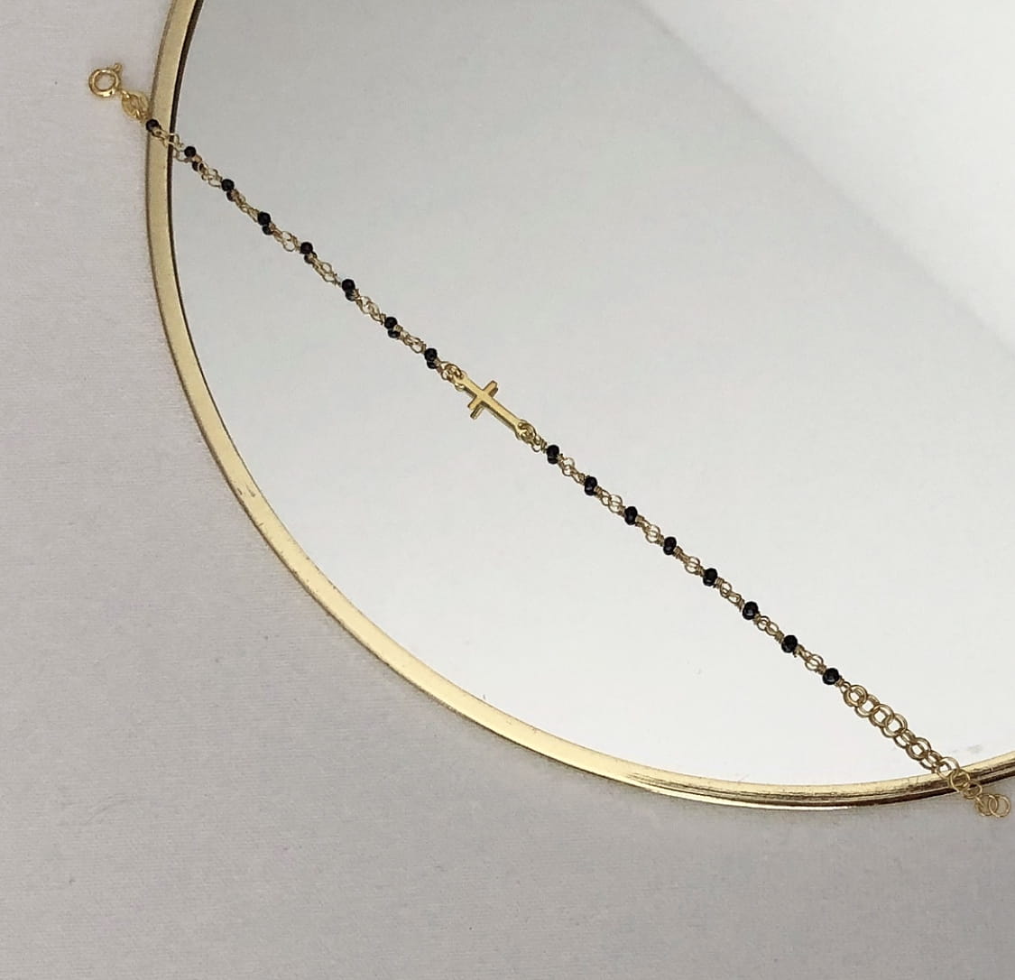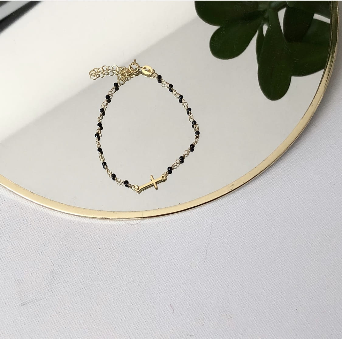Srebrna pozłacana bransoletka z czarnymi małymi onyksami krzyżyk