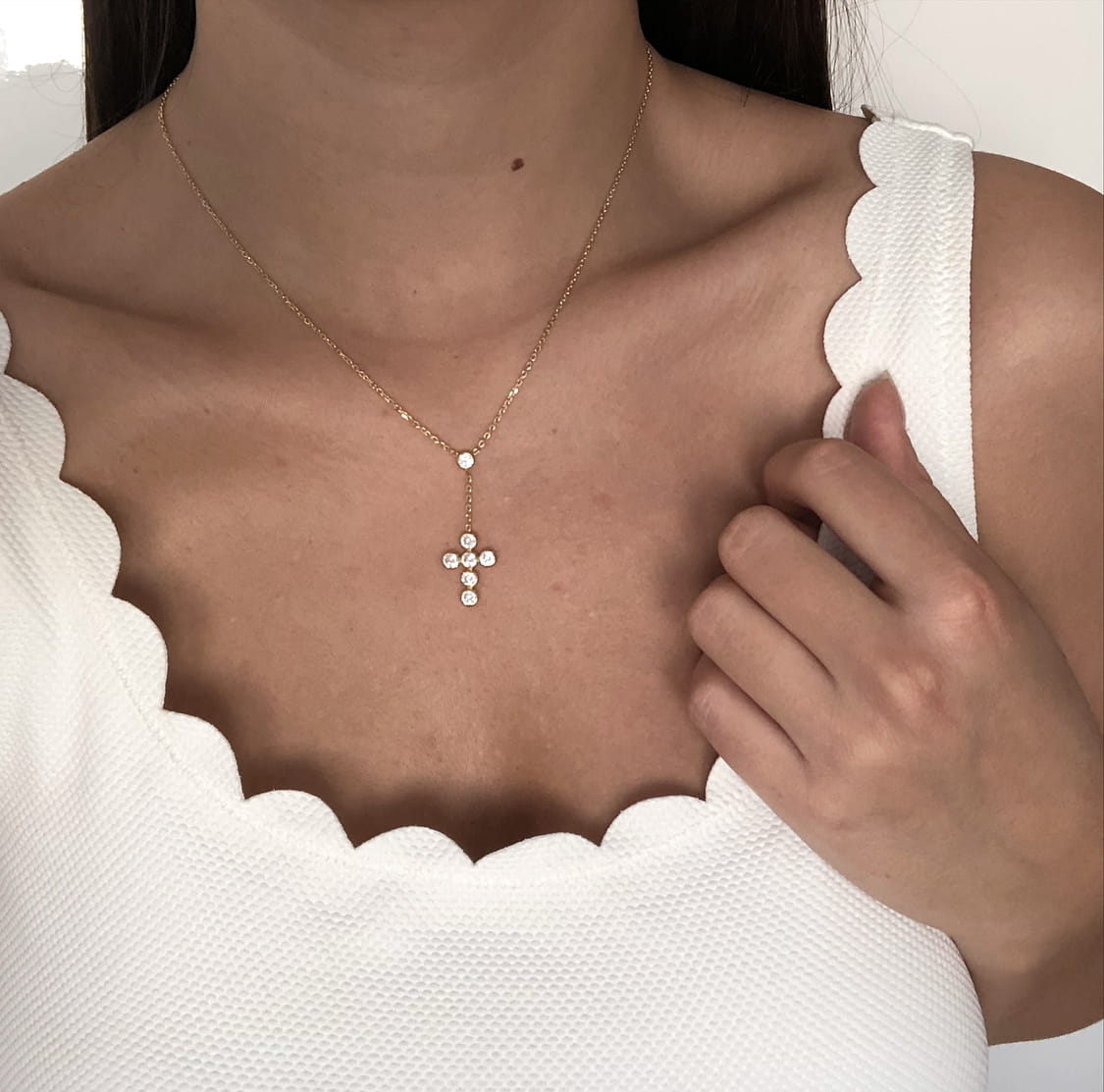 Srebrny pozłacany naszyjnik krawatka z krzyżem i cyrkoniami