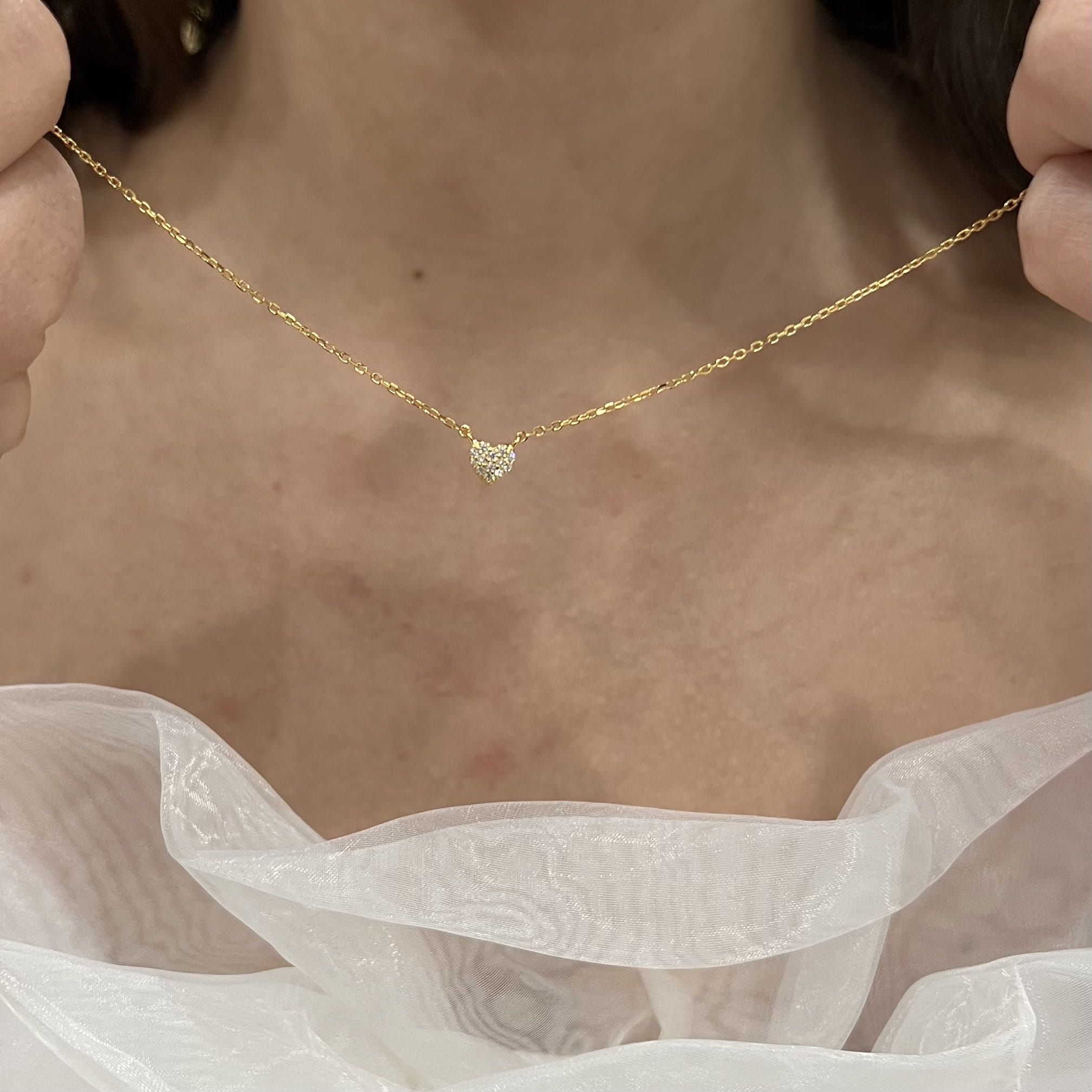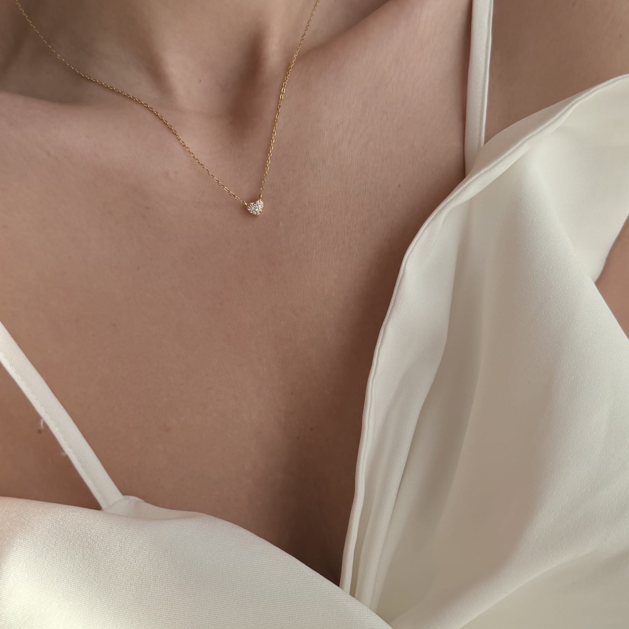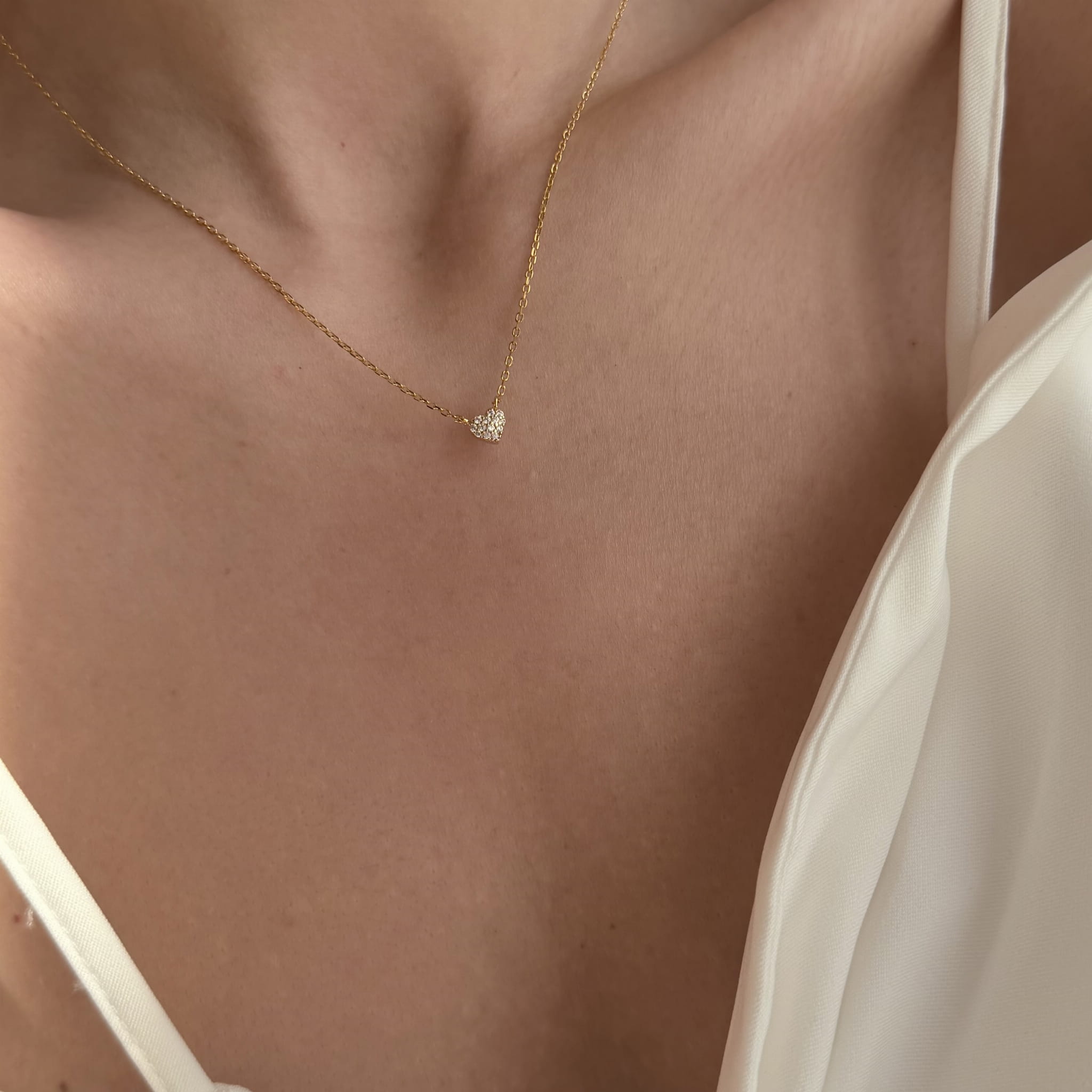 Zawieszka w kształcie serca o wielkości 5,2 mm, ozdobiona drobnymi cyrkoniami, jest dyskretna i elegancka – idealna do codziennych stylizacji. Regulowana długość 42–45 cm pozwala dopasować naszyjnik do dekoltu, a masa ok. 1,85 gsprawia, że jest niemal niewyczuwalny na szyi.