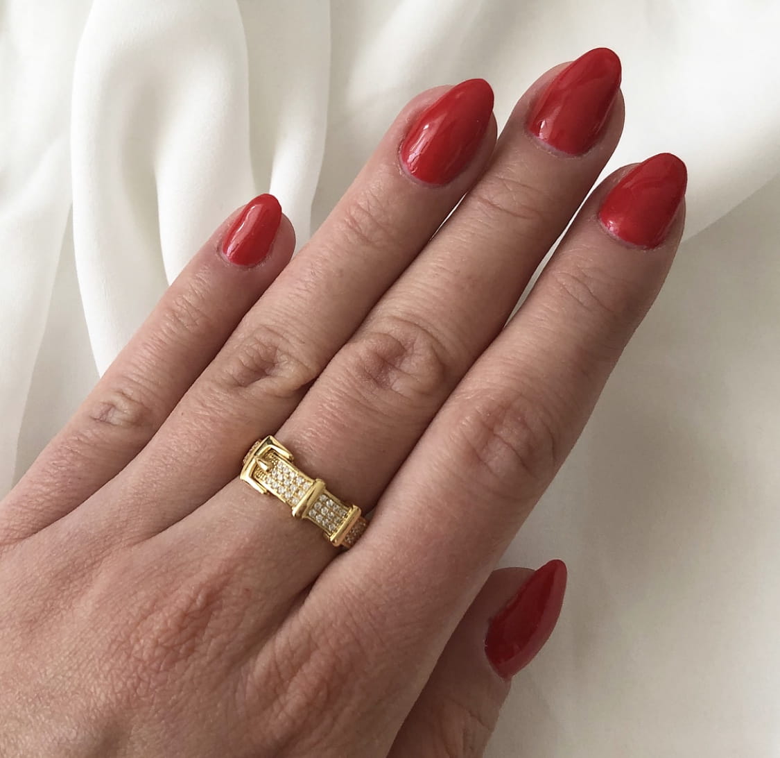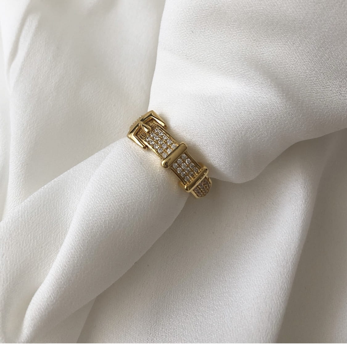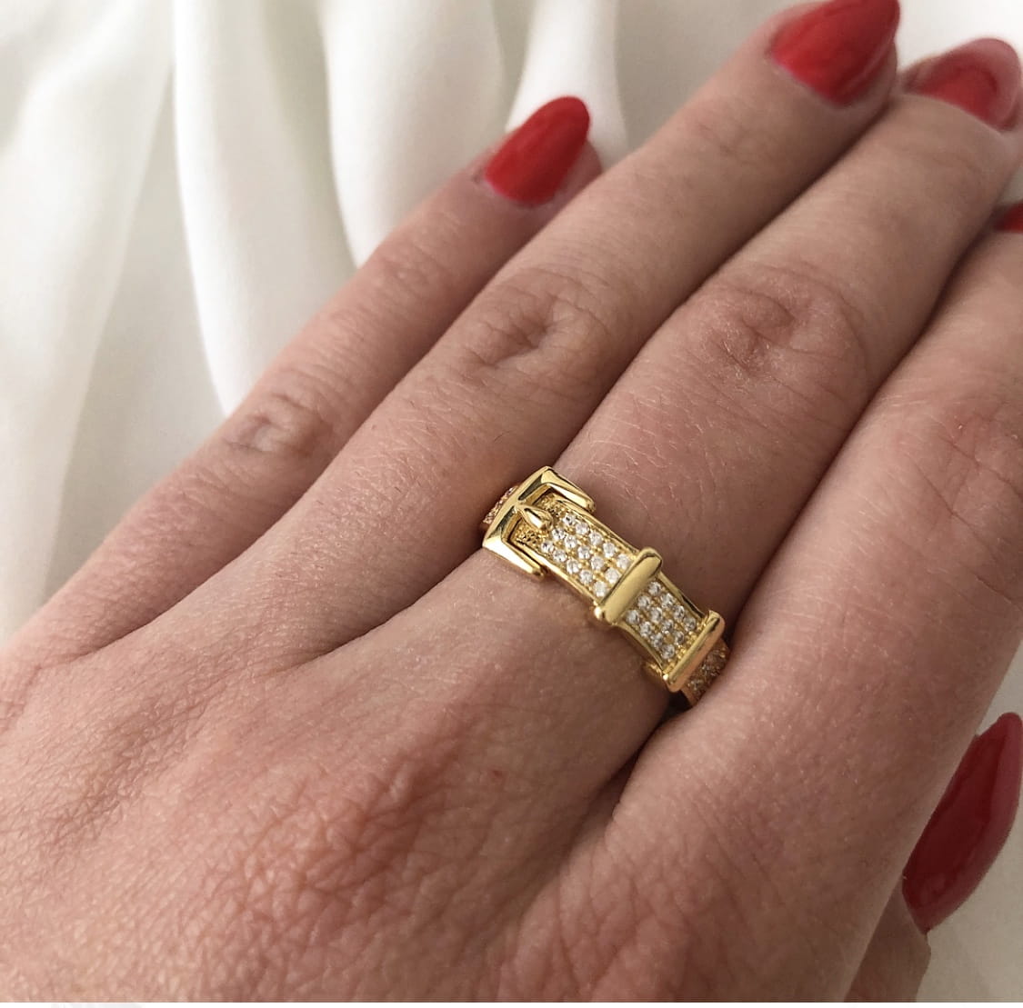 Srebrny pozłacany pierścionek pasek z cyrkoniami